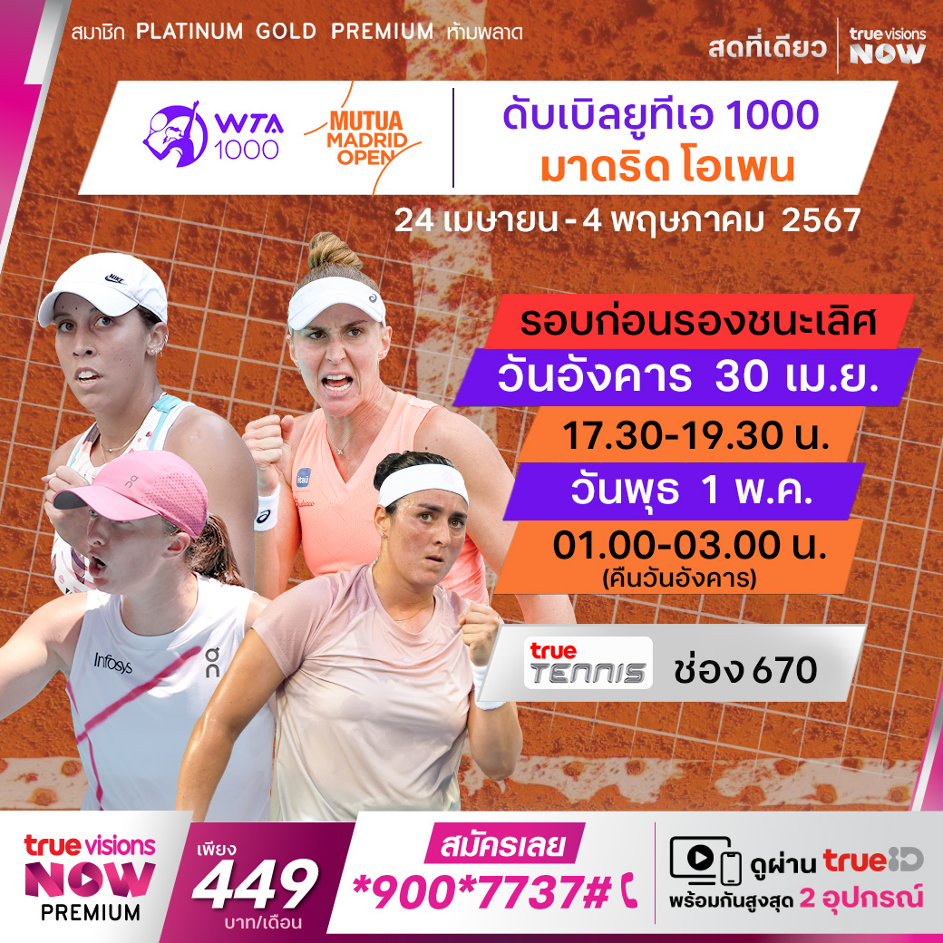ติดตามชมเทนนิสหญิงรายการใหญ่ รายการระดับ WTA 1000 จากกรุงมาดริด ประเทศสเปน ในรายการ มาดริด โอเพ่น เดินทางมาถึงในรอบก่อนรองชนะเลิศแล้ว ร่วมลุ้นกันว่านักเทนนิสคนใดจะคว้าแชมป์ไปครอง ชมสดที่ ทรูวิชั่นส์