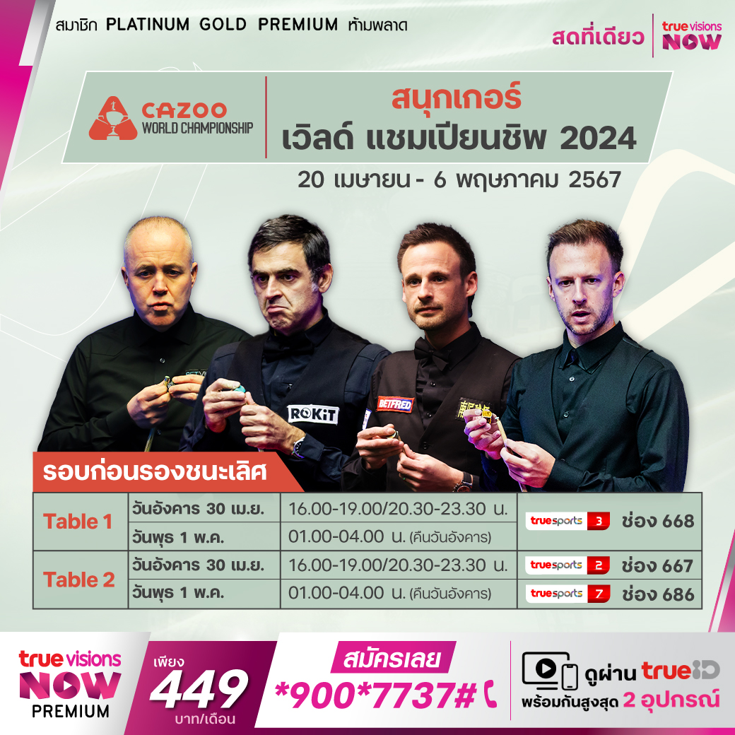 ศึกสนุกเกอร์ชิงแชมป์โลก เวิลด์ แชมเปี้ยนชิพ 2024 การดวลความแม่นของบรรดานักสนุกเกอร์ที่เก่งที่สุดในยุคนี้ ณ ครูซิเบิ้ล เธียเตอร์ เมืองเชฟฟิลด์ ประเทศอังกฤษ รายการส่งท้ายของฤดูกาล ที่เหล่านักสนุกเกอร์ฝีมือระดับโลกจะมาวัดฝีมือกันว่าใครจะคว้าแชมป์อันทรงเกียรตินี้ไปครองได้ ชมสด เอ็กซ์คลูซีฟ ที่เดียวที่ ทรูวิชั่นส์