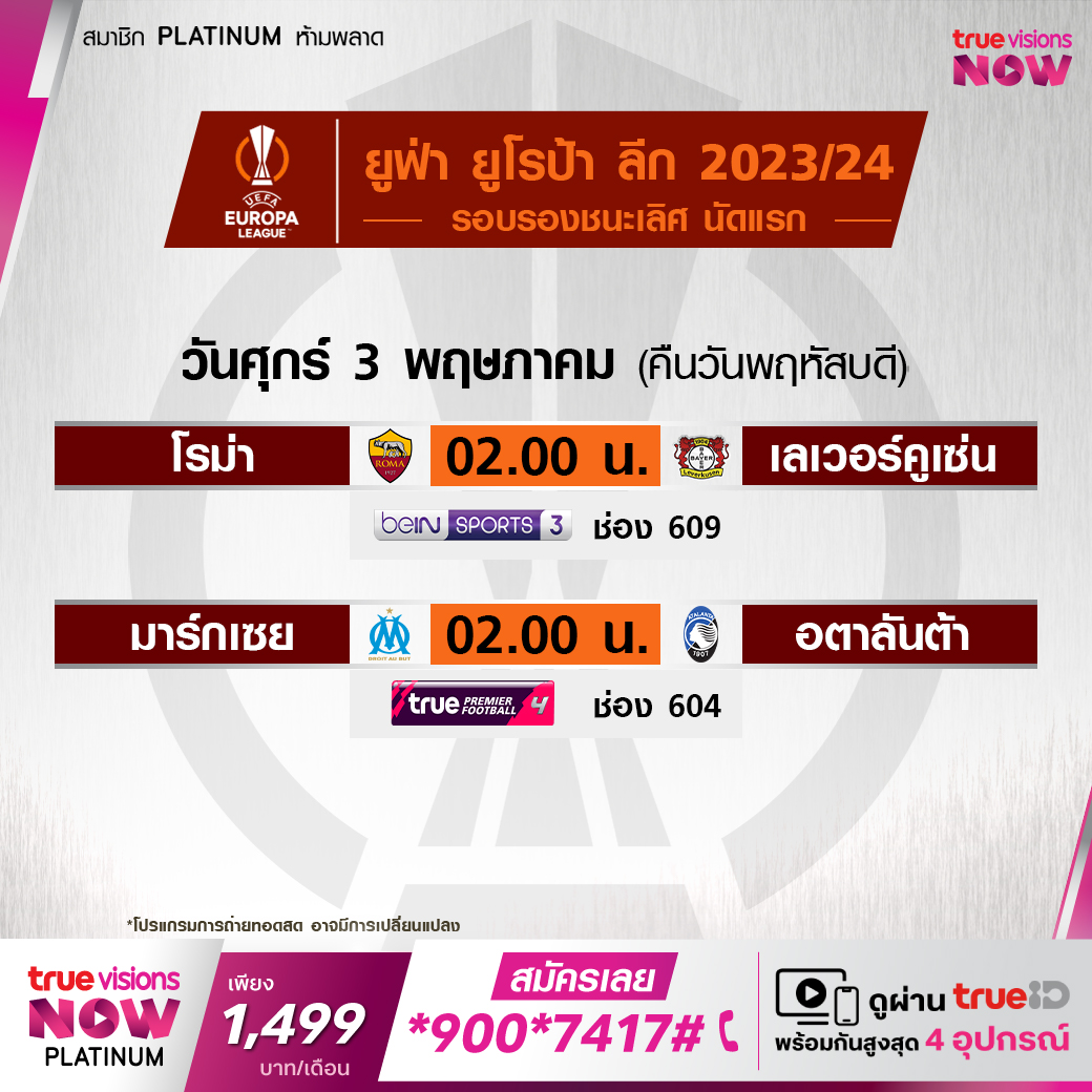 Roma vs Leverkusen เวลา 02.00-04.00 ทางช่อง beIN 3 (609)
