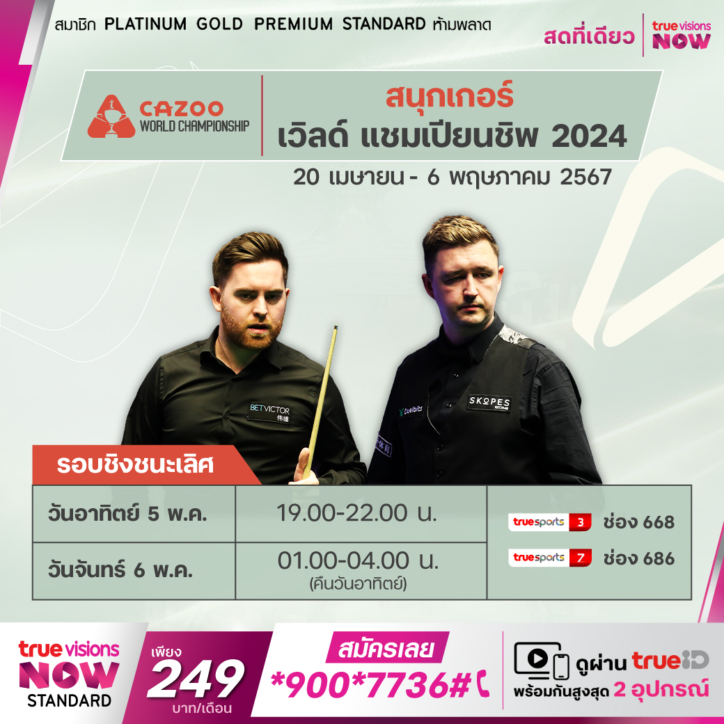 ศึกสนุกเกอร์ชิงแชมป์โลก เวิลด์ แชมเปี้ยนชิพ 2024 การดวลความแม่นของบรรดานักสนุกเกอร์ที่เก่งที่สุดในยุคนี้ ณ ครูซิเบิ้ล เธียเตอร์ เมืองเชฟฟิลด์ ประเทศอังกฤษ รายการส่งท้ายของฤดูกาล เดินทางมาถึงในรอบชิงชนะเลิศแล้ว ใครจะคว้าแชมป์อันทรงเกียรตินี้ไปครองได้ ชมสด เอ็กซ์คลูซีฟ ที่เดียวที่ ทรูวิชั่นส์