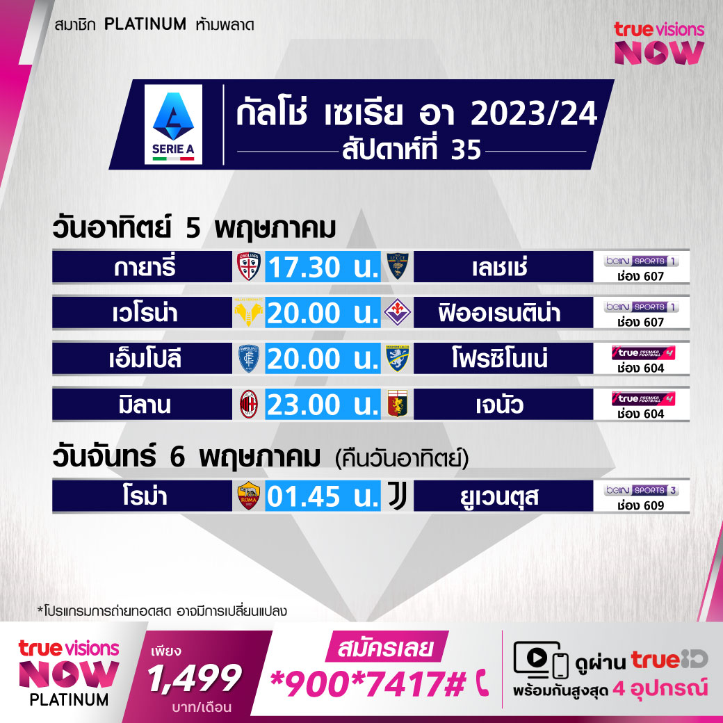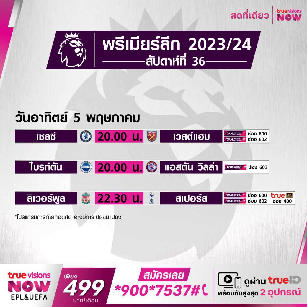 วันนี้มีอะไรดูที่ ทรูวิชั่นส์ ประจำวันอาทิตย์ที่ 5 พฤษภาคม 67 ยังคงมีกีฬาที่น่าสนใจให้ได้ตามลุ้นตามเชียร์กันเหมือนเดิม โดยในส่วนของฟุตบอลนั้นยังมีศึกพรีเมียร์ลีก อังกฤษ, กัลโช่ เซเรีย อา อิตาลี, บุนเดสลีกา เยอรมนี และ ลา ลีกา สเปน ให้ได้ตามเชียร์กันต่อเนื่อง ส่วนกีฬาอื่นๆ ยังมีศึกฟอร์มูล่า วัน รายการ ไมอามี่ กรังด์ปรีซ์, สนุกเกอร์ชิงแชมป์โลก เวิลด์ แชมเปี้ยนชิพ 2024 ที่ครูซิเบิ้ล เธียเตอร์, เทนนิส เอทีพี ทัวร์ รายการ มาดริด โอเพ่น, กอล์ฟ พีจีเอ ทัวร์ รายการ เดอะ ซีเจ คัพ ไบรอน เนลสัน และบาสเกตบอลเอ็นบีเอ งานนี้ ทรูวิชั่นส์ จัดเต็มให้ชมกันถึงบ้าน