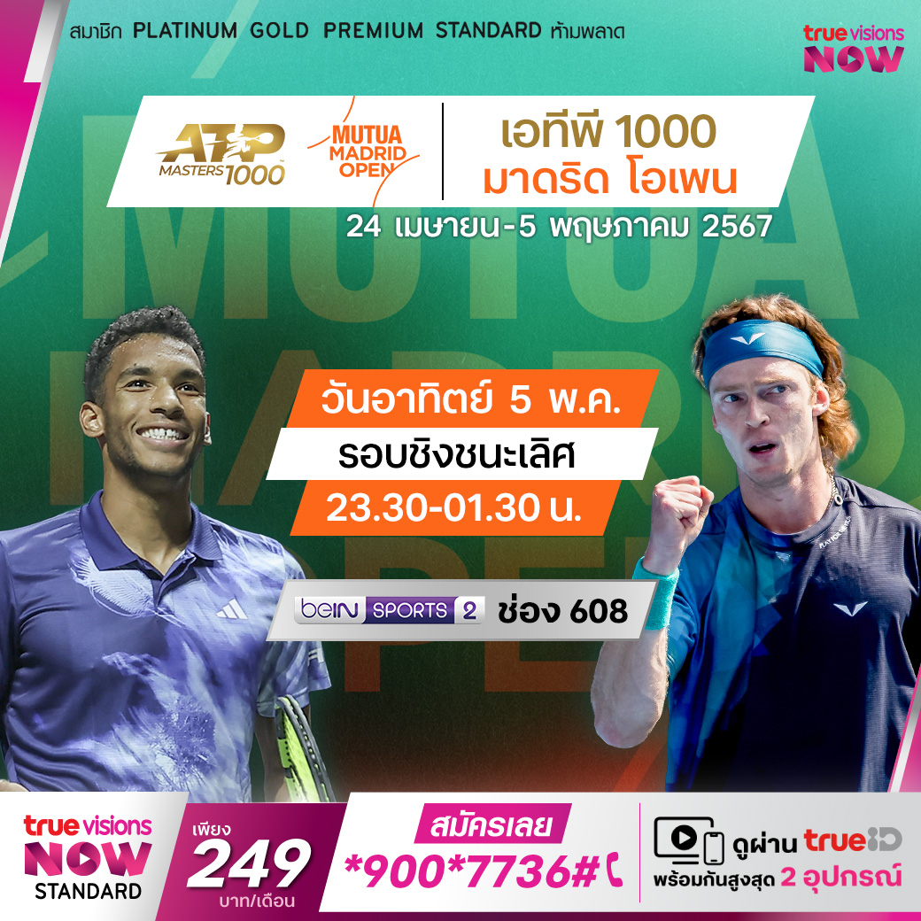 ติดตามชมเทนนิสชายรายการใหญ่ ระดับ ATP 1000 จากกรุงมาดริด ประเทศสเปน ในรายการ มาดริด โอเพ่น เดินทางมาถึงในรอบชิงชนะเลิศแล้ว ร่วมลุ้นกันว่านักเทนนิสคนใดจะคว้าแชมป์ไปครอง ชมสดที่ ทรูวิชั่นส์