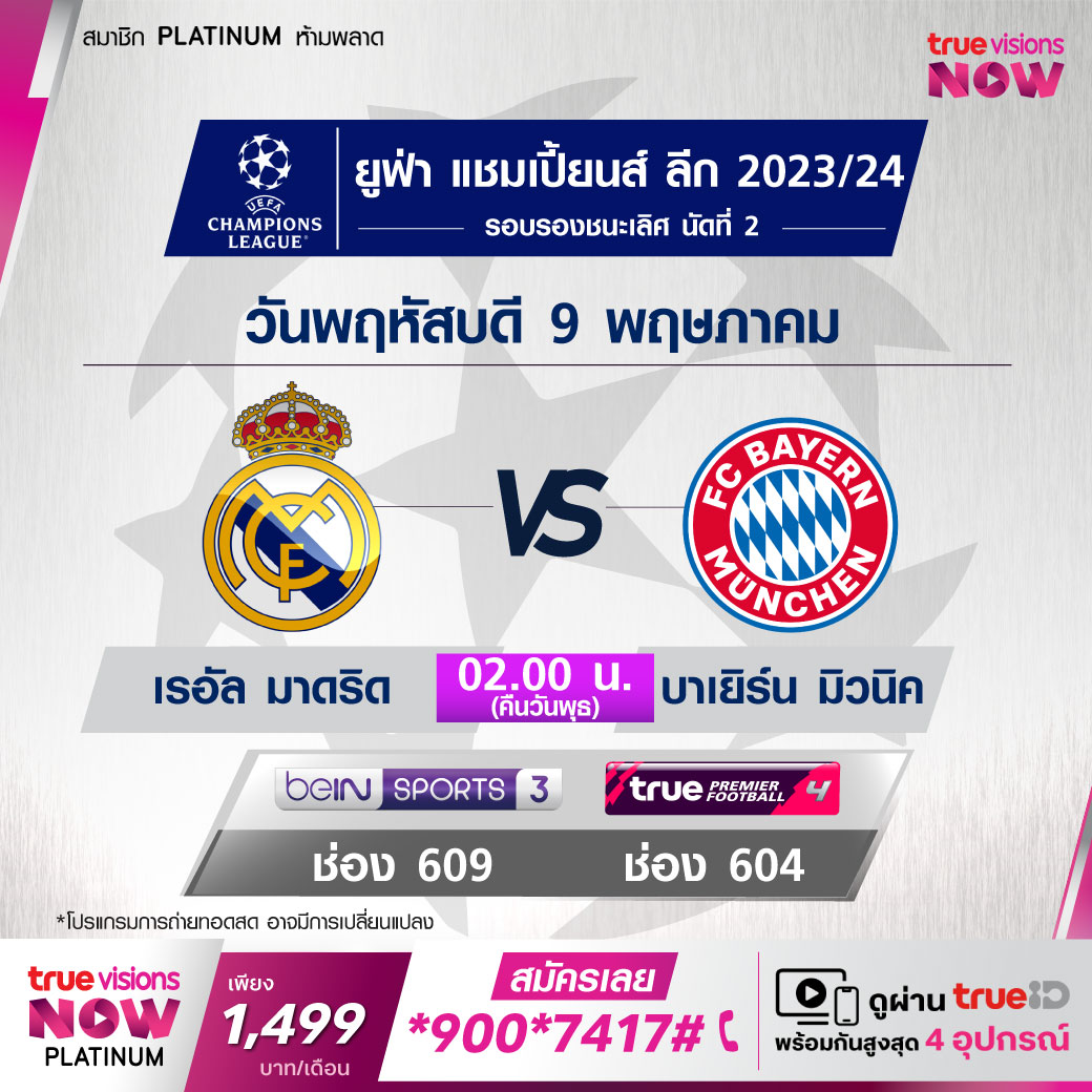 Real Madrid vs Bayern เวลา 02.00-04.00 ทางช่อง beIN 3 (609) /TPF 4 (604)