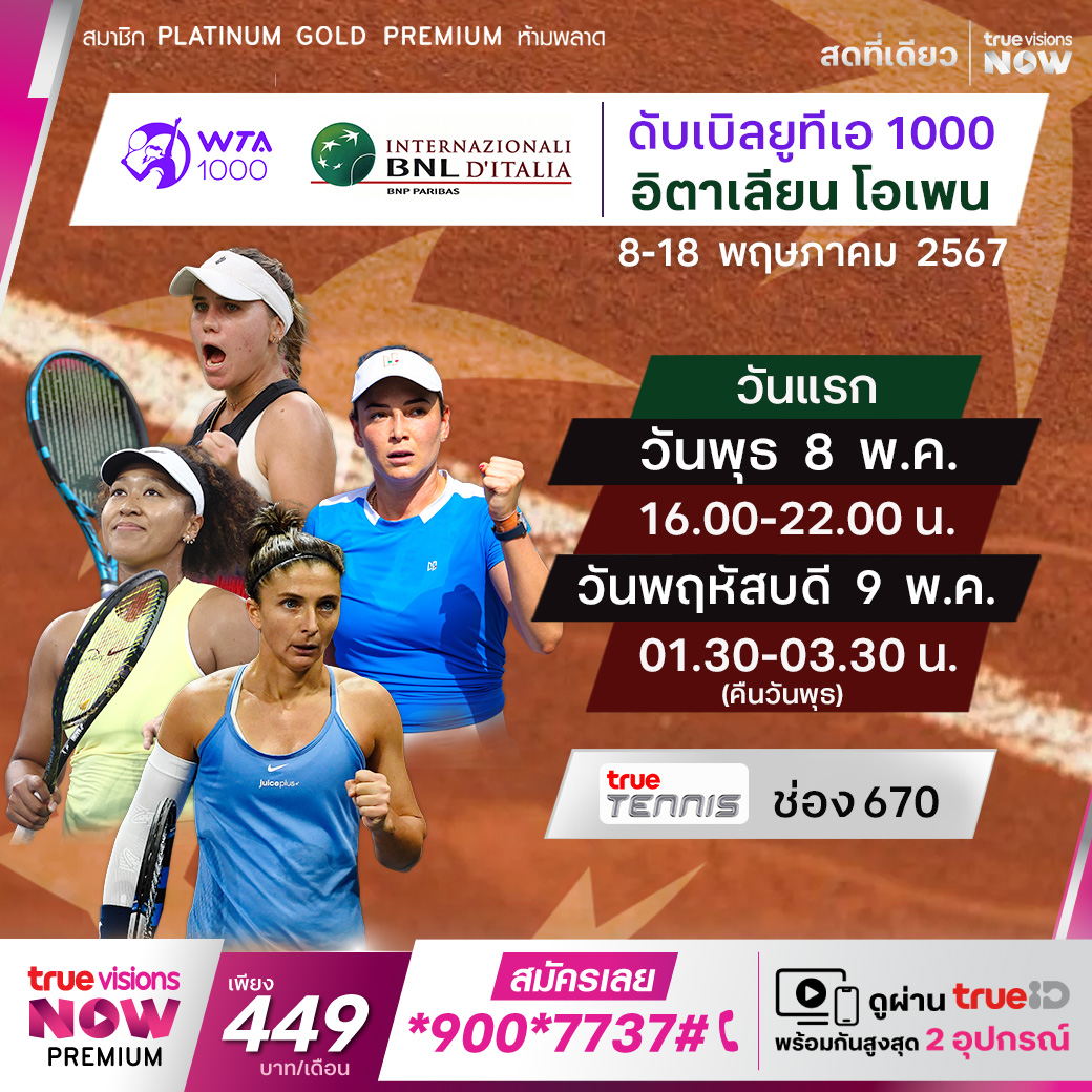 ติดตามชมต่อเนื่องกับเทนนิสหญิงรายการใหญ่ ระดับ WTA 1000 ในรายการ อิตาเลียน โอเพ่น จากกรุงโรม ประเทศอิตาลี ร่วมด้วยนักเทนนิสชื่อดังอย่าง อิกา ซิออนเทค, อารีนา ซาบาเลนก้า และ โคโค กอฟ์ฟ ร่วมลุ้นกันว่าใครจะคว้าแชมป์รายการนี้ไปครอง ชมสด ที่ ทรูวิชั่นส์