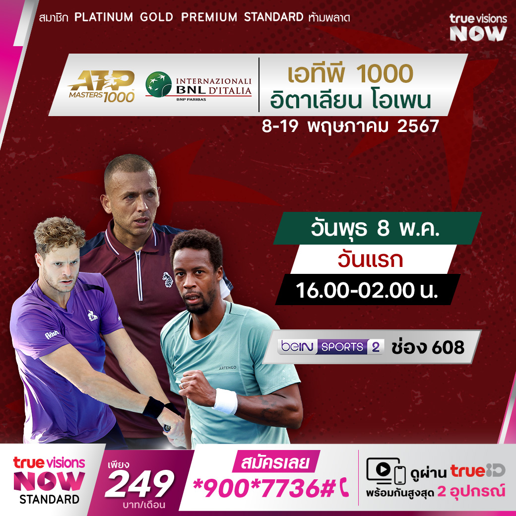 ติดตามชมต่อเนื่องกับเทนนิสชายรายการใหญ่ ระดับ ATP 1000 ในรายการ อิตาเลียน โอเพ่น จากกรุงโรม ประเทศอิตาลี ร่วมด้วยนักเทนนิสชื่อดัง อาทิ โนวัค ยอโควิช และ ยานนิค ซินเนอร์ ร่วมลุ้นกันว่าใครจะคว้าแชมป์รายการนี้ไปครอง ชมสด ที่ ทรูวิชั่นส์