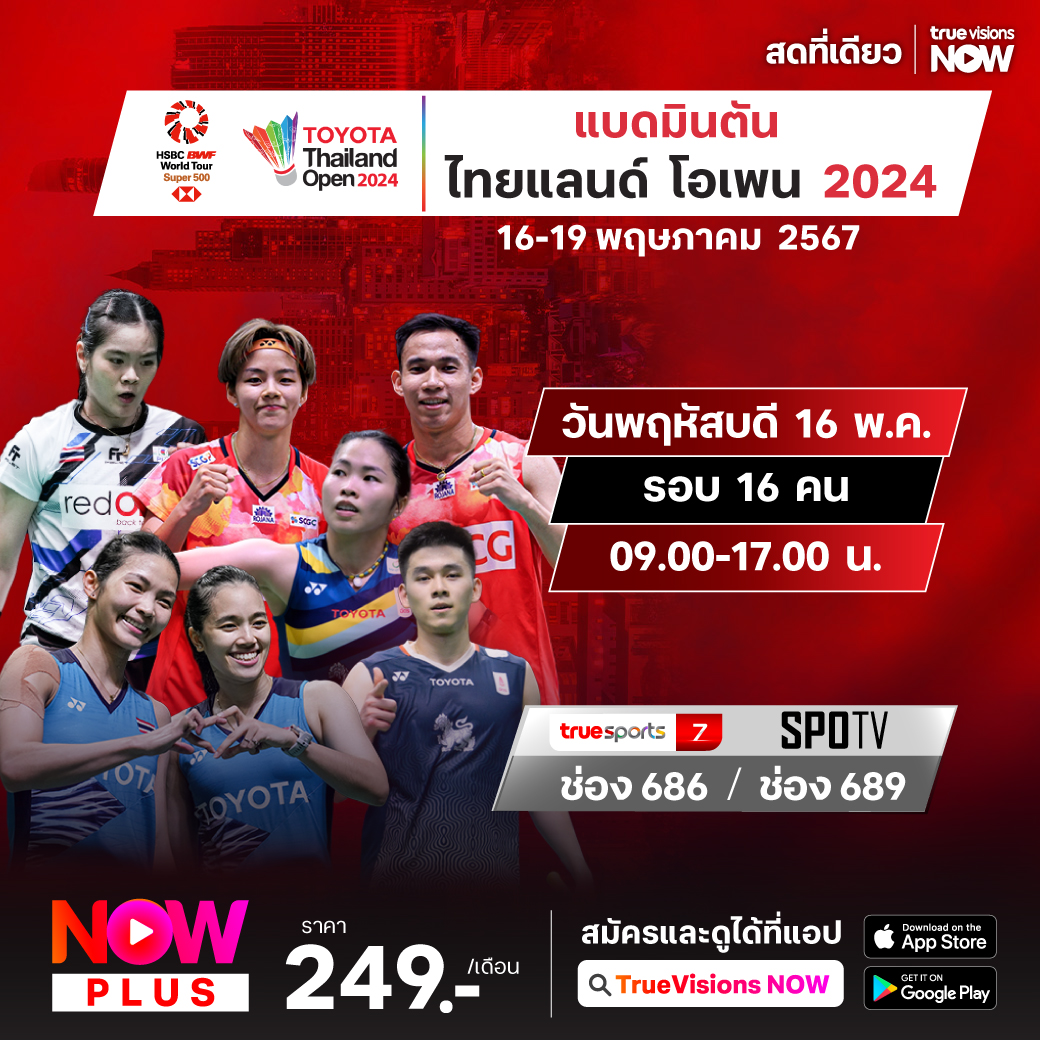 แบดมินตัน บีดับเบิ้ลยูเอฟ รายการ ไทยแลนด์ โอเพ่น 2024 ระดับเวิลด์ ทัวร์ ซูเปอร์ 500 ร่วมเชียร์นักแบดมินตันไทยเปิดศึกกับคู่แข่งระดับโลกจากต่างชาติ เพื่อคว้าแชมป์ในบ้านเกิด ชมสด จุใจ เอ็กซ์คลูซีฟ ที่เดียวที่ ทรูวิชั่นส์