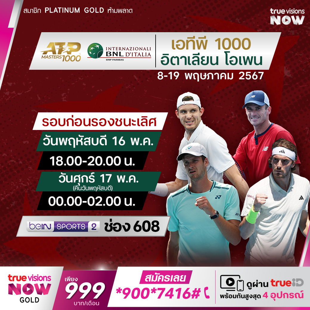 เทนนิสชายรายการใหญ่ ระดับ ATP 1000 ในรายการ อิตาเลียน โอเพ่น จากกรุงโรม ประเทศอิตาลี มาถึงในรอบก่อนรองชนะเลิศแล้ว ร่วมลุ้นกันว่าใครจะคว้าแชมป์รายการนี้ไปครอง ชมสด ที่ ทรูวิชั่นส์