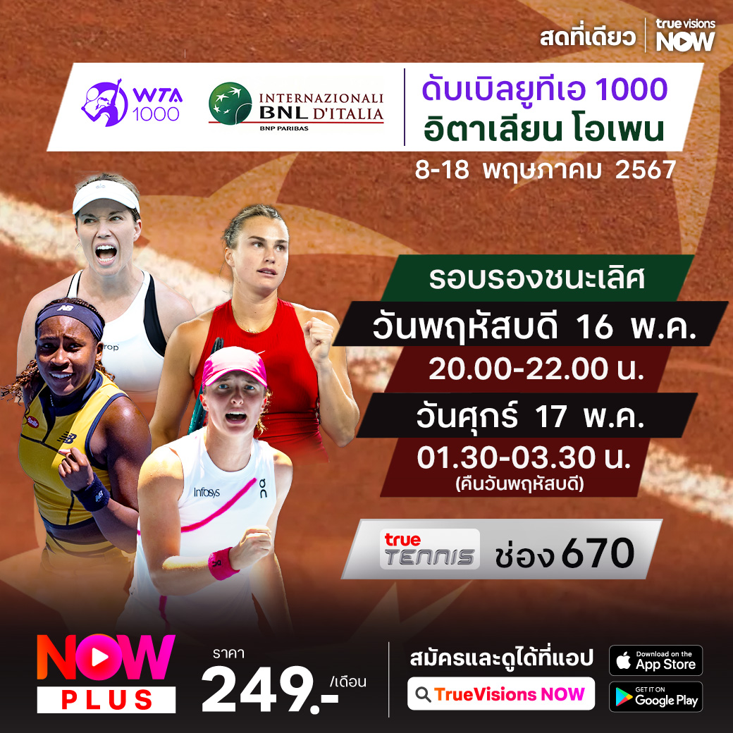 เทนนิสหญิงรายการใหญ่ ระดับ WTA 1000 ในรายการ อิตาเลียน โอเพ่น จากกรุงโรม ประเทศอิตาลี มาถึงในรอบรองชนะเลิศแล้ว ร่วมลุ้นกันว่าใครจะคว้าแชมป์รายการนี้ไปครอง ชมสด ที่ ทรูวิชั่นส์