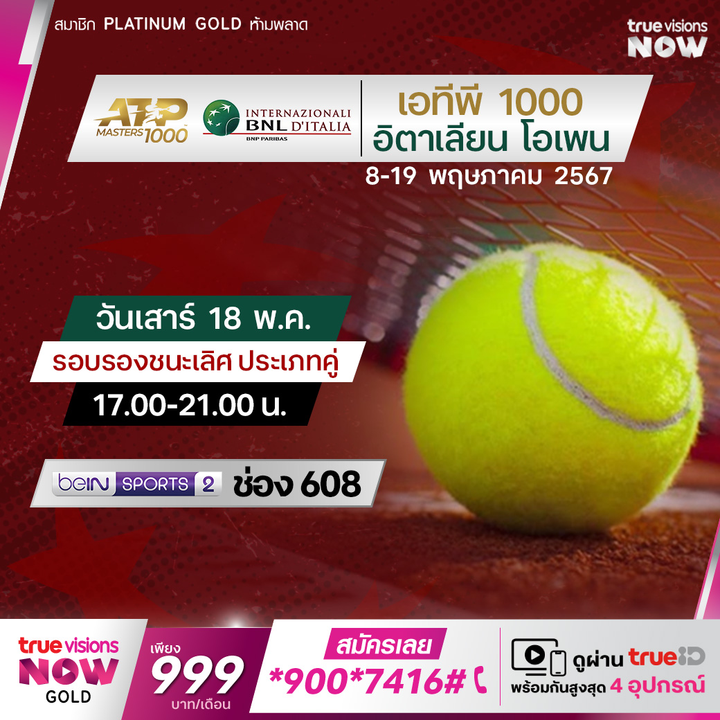 เทนนิสชายรายการใหญ่ ระดับ ATP 1000 ในรายการ อิตาเลียน โอเพ่น จากกรุงโรม ประเทศอิตาลี มาถึงในรอบรองชนะเลิศแล้ว ร่วมลุ้นกันว่าใครจะคว้าแชมป์รายการนี้ไปครอง ชมสด ที่ ทรูวิชั่นส์