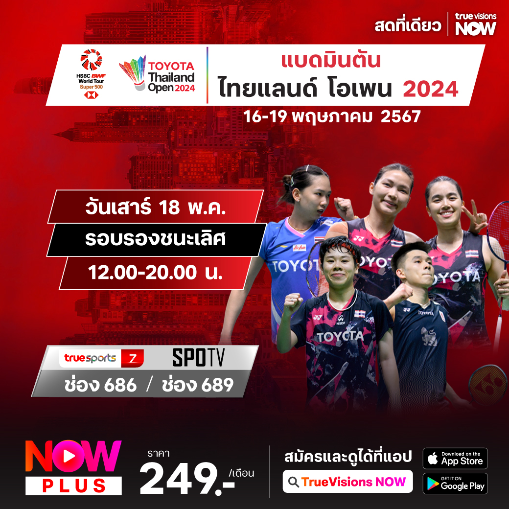 แบดมินตัน บีดับเบิ้ลยูเอฟ รายการ ไทยแลนด์ โอเพ่น 2024 ระดับเวิลด์ ทัวร์ ซูเปอร์ 500 ร่วมเชียร์นักแบดมินตันไทยเปิดศึกกับคู่แข่งระดับโลกจากต่างชาติ เพื่อคว้าแชมป์ในบ้านเกิด ชมสด จุใจ เอ็กซ์คลูซีฟ ที่เดียวที่ ทรูวิชั่นส์