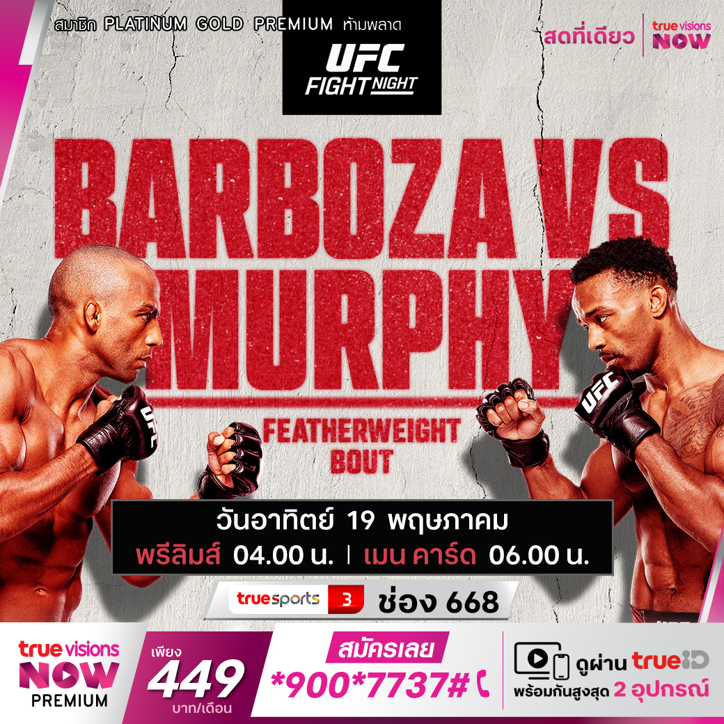 ยูเอฟซี ไฟต์ ไนท์ สัปดาห์นี้ กลับไปบู๊ดุเดือดกันที่ ยูเอฟซี เอเพ็กซ์ ลาส เวกัส คู่เอก เอ็ดสัน บาร์บอซ่า สุดยอดฝีมือประสบการณ์โชกโชนจากบราซิล เปิดศึกกับนักสู้ดาวรุ่งจากอังกฤษ ลีโรน เมอร์ฟี่ ร่วมด้วย เคออส วิลเลี่ยมส์ ท้าชน คาร์ลตัน แฮร์ริส ชมสด จุใจ เอ็กซ์คลูซีฟ ทางทรูวิชั่นส์