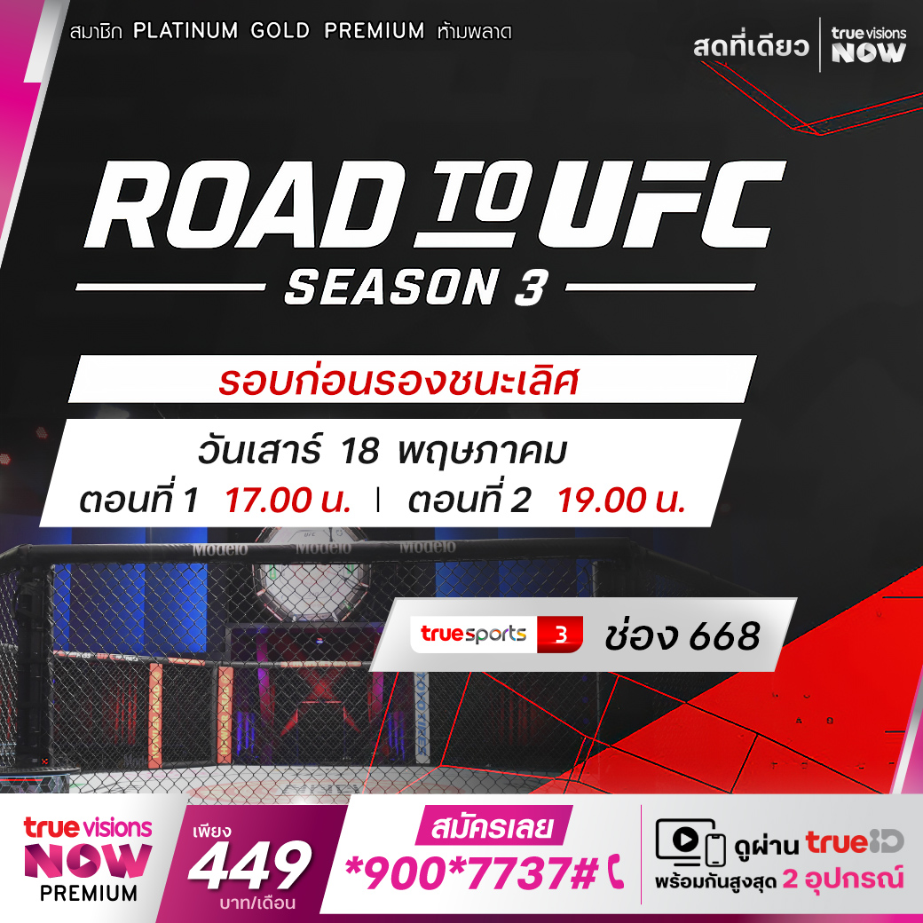 โร้ด ทู ยูเอฟซี ซีซั่น 3 รอบ 8 คนสุดท้าย พร้อมระเบิดความมันส์ที่นครเซี่ยงไฮ้ ประเทศจีน ในพิกัดเฟเธอร์เวต, แบนตั้มเวต และฟลายเวต ร่วมด้วยรุ่นสตรอว์เวตหญิง และฟลายเวตหญิง นักสู้คนไหนจะคว้าชัย เดินหน้าสู่รอบรองชนะเลิศ ชมสด จุใจ เอ็กซ์คลูซีฟ ครบทุกคู่ ที่เดียวที่ ทรูวิชั่นส์