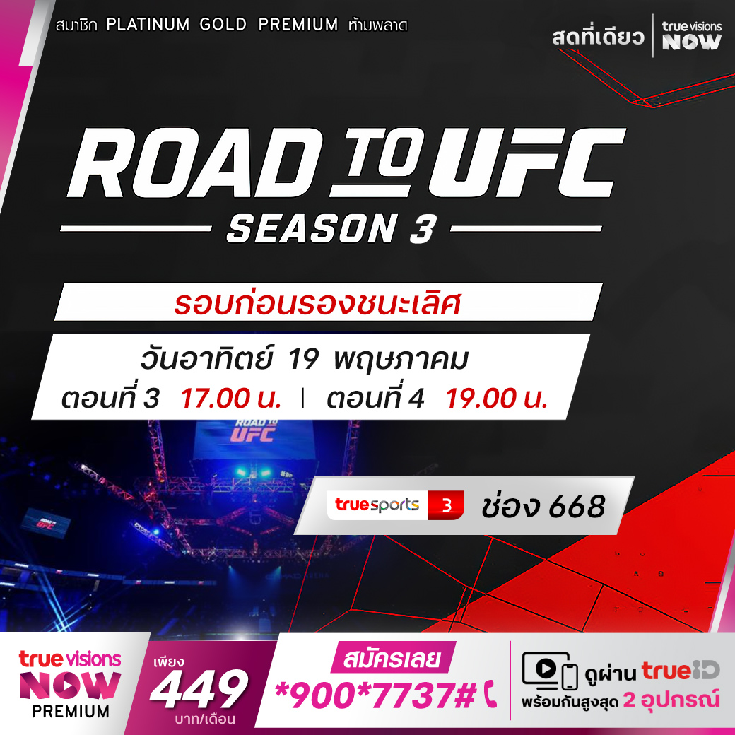 โร้ด ทู ยูเอฟซี ซีซั่น 3 รอบ 8 คนสุดท้าย พร้อมระเบิดความมันส์ที่นครเซี่ยงไฮ้ ประเทศจีน ในพิกัดเฟเธอร์เวต, แบนตั้มเวต และฟลายเวต ร่วมด้วยรุ่นสตรอว์เวตหญิง และฟลายเวตหญิง นักสู้คนไหนจะคว้าชัย เดินหน้าสู่รอบรองชนะเลิศ ชมสด จุใจ เอ็กซ์คลูซีฟ ครบทุกคู่ ที่เดียวที่ ทรูวิชั่นส์