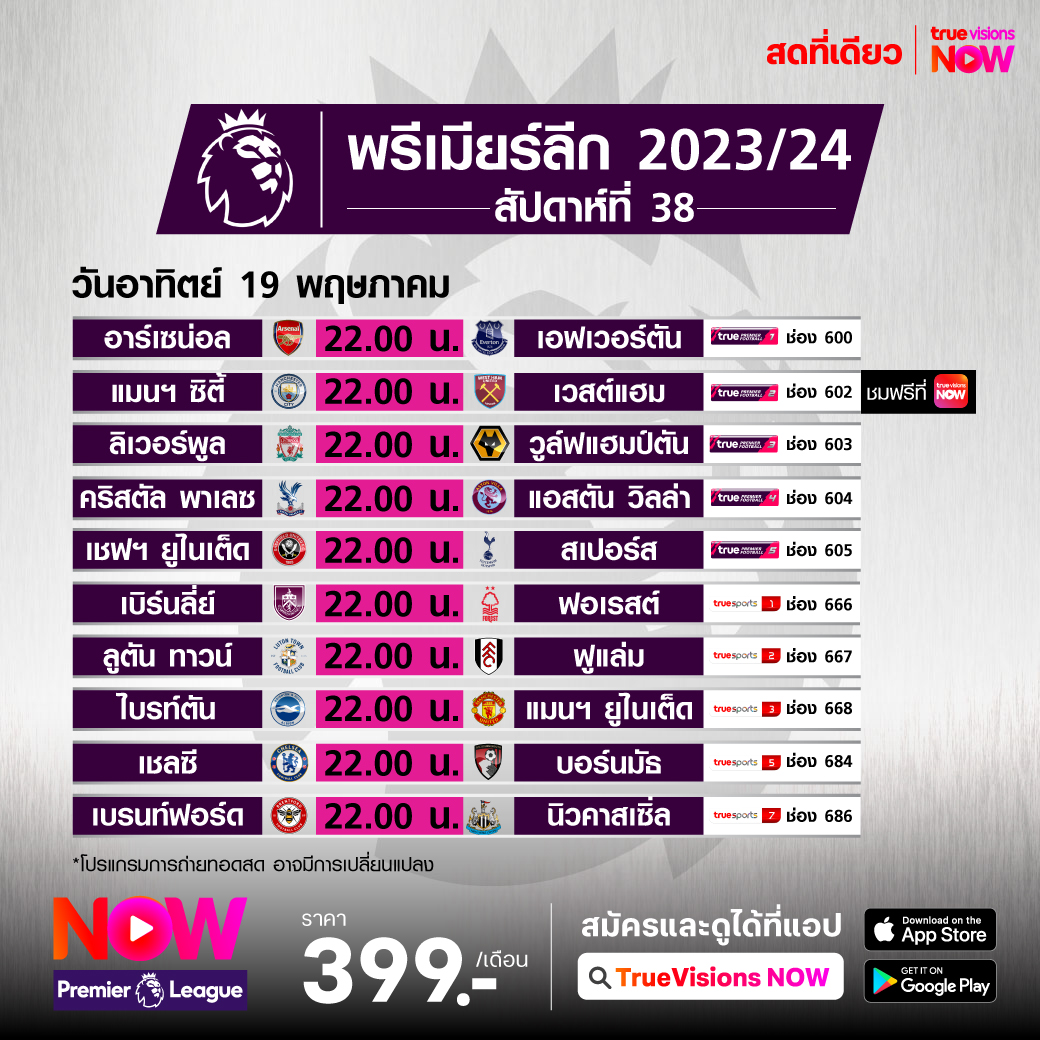 Man City vs West Ham Utd เวลา 22:00 - 00:00 ทางช่อง TPF 2 (602)/ 4K (400)