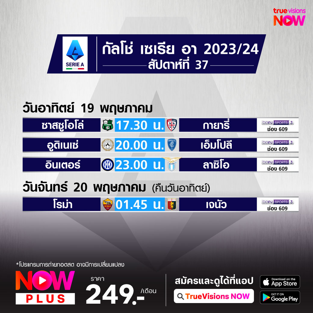 วันนี้มีอะไรดูที่ ทรูวิชั่นส์ ประจำวันอาทิตย์ที่ 19 พฤษภาคม 67 ยังคงมีกีฬาที่น่าสนใจให้ได้ตามลุ้นตามเชียร์กันเหมือนเดิม โดยในส่วนของฟุตบอลนั้นยังมีศึกพรีเมียร์ลีก อังกฤษ, กัลโช่ เซเรีย อา อิตาลี, ลา ลีกา สเปน และ ลีก เอิง ฝรั่งเศส ให้ได้ตามเชียร์กันต่อ ส่วนกีฬาอื่นๆ ยังมีศึกฟอร์มูล่า วัน รายการ เอมิเลีย โรมันญ่า กรังด์ปรีซ์ ที่ อิตาลี, เทนนิส เอทีพี ทัวร์ รายการ อิตาเลียน โอเพ่น, ดับเบิ้ลยูทีเอ ทัวร์ รายการ สตราส์บูร์ก อินเตอร์เนชั่นแนล, กอล์ฟ พีจีเอ ทัวร์ รายการเมเจอร์ที่สองของปี พีจีเอ แชมเปี้ยนชิพ, แอลพีจีเอ ทัวร์ รายการ มิซูโฮะ อเมริกาส์ โอเพ่น, แบดมินตัน บีดับเบิ้ลยูเอฟ รายการ ไทยแลนด์ โอเพ่น, โร้ด ทู ยูเอฟซี ซีซั่น 3 และบาสเกตบอลเอ็นบีเอ งานนี้ ทรูวิชั่นส์ จัดเต็มให้ชมกันถึงบ้าน