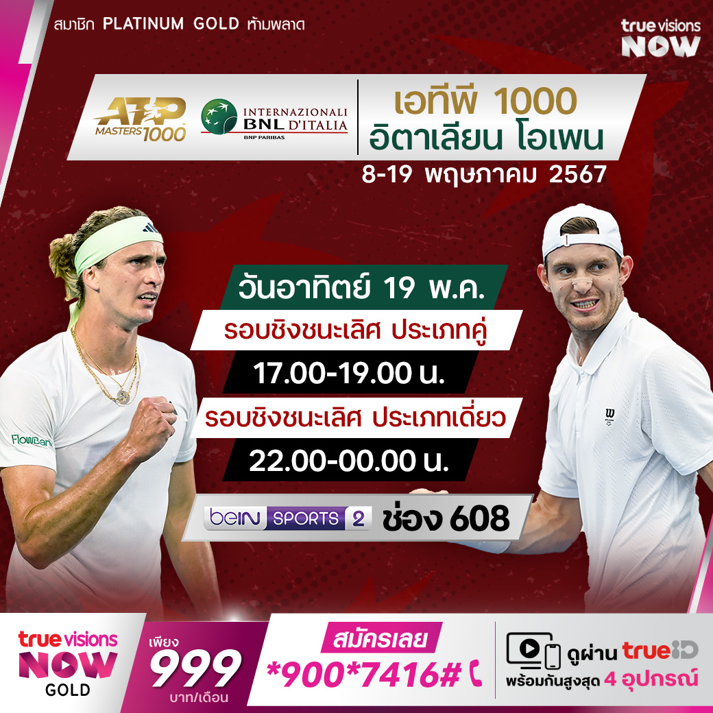 เทนนิสชายรายการใหญ่ ระดับ ATP 1000 ในรายการ อิตาเลียน โอเพ่น จากกรุงโรม ประเทศอิตาลี มาถึงในรอบชิงชนะเลิศแล้ว ร่วมลุ้นกันว่าใครจะคว้าแชมป์รายการนี้ไปครอง ชมสด ที่ ทรูวิชั่นส์
