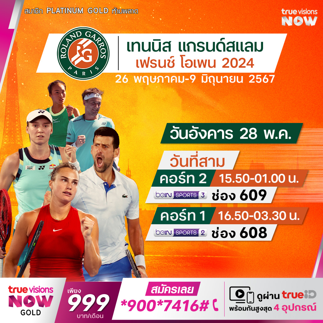 ติดตามชมศึกเทนนิส โรลังด์ การ์รอส หรือ เฟร้นช์ โอเพ่น แกรนด์สแลมที่ 2 ของปี การแข่งขันสุดทรหดบนคอร์ทดิน ที่พิสูจน์ความแข็งแกร่งทั้งร่างกายและจิตใจ มาครบทั้งแชมป์เก่าชายเดี่ยว โนวัค ยอโควิช แชมป์เก่าหญิงเดี่ยว อิกา ซิออนเทค ใครจะก้าวไปเป็นแชมป์ในบั้นปลาย ชมสด เอ็กซ์คลูซีฟ ตลอดทั้งทัวร์นาเมนท์ ที่เดียวที่ ทรูวิชั่นส์