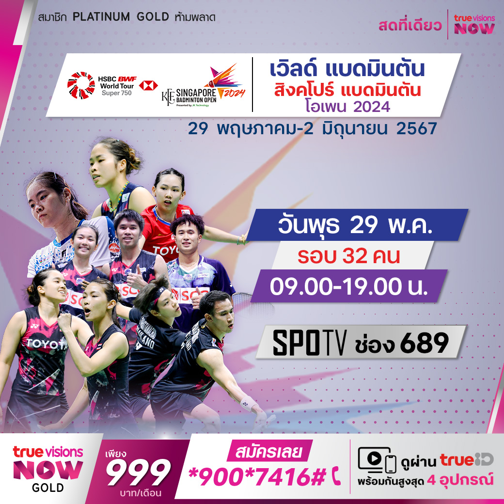แบดมินตัน บีดับเบิ้ลยูเอฟ รายการ สิงคโปร์ แบดมินตัน โอเพ่น 2024 ความมันส์ระดับเวิลด์ ทัวร์ ซูเปอร์ 750 ที่สิงคโปร์ โดยมีเงินรางวัลล่อใจมากถึง 850,000 เหรียญสหรัฐฯ ใครจะเข้ารอบไปลุ้นแชมป์ ชมสด จุใจ เอ็กซ์คลูซีฟ ที่เดียวที่ ทรูวิชั่นส์