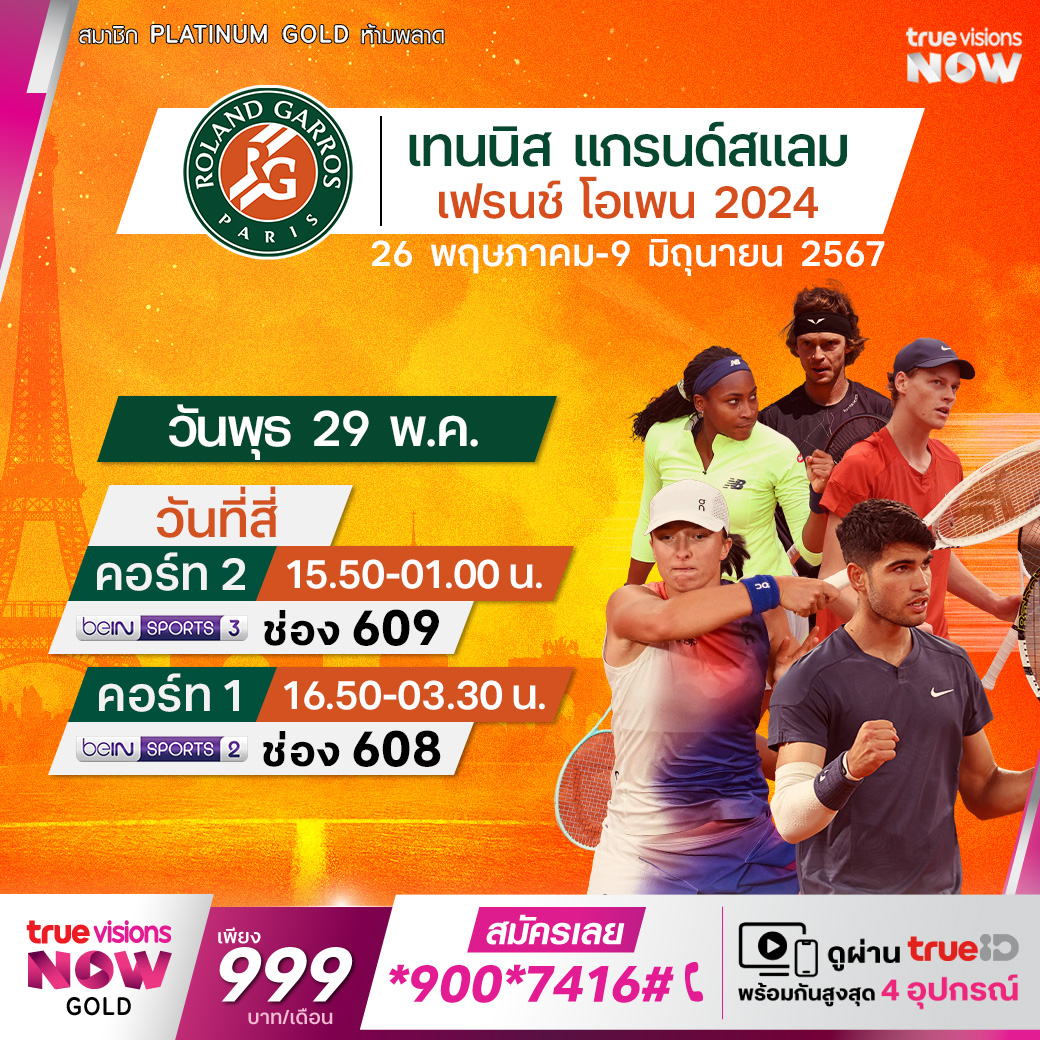 ติดตามชมศึกเทนนิส โรลังด์ การ์รอส หรือ เฟร้นช์ โอเพ่น แกรนด์สแลมที่ 2 ของปี การแข่งขันสุดทรหดบนคอร์ทดิน ที่พิสูจน์ความแข็งแกร่งทั้งร่างกายและจิตใจ มาครบทั้งแชมป์เก่าชายเดี่ยว โนวัค ยอโควิช แชมป์เก่าหญิงเดี่ยว อิกา ซิออนเทค ใครจะก้าวไปเป็นแชมป์ในบั้นปลาย ชมสด เอ็กซ์คลูซีฟ ตลอดทั้งทัวร์นาเมนท์ ที่เดียวที่ ทรูวิชั่นส์