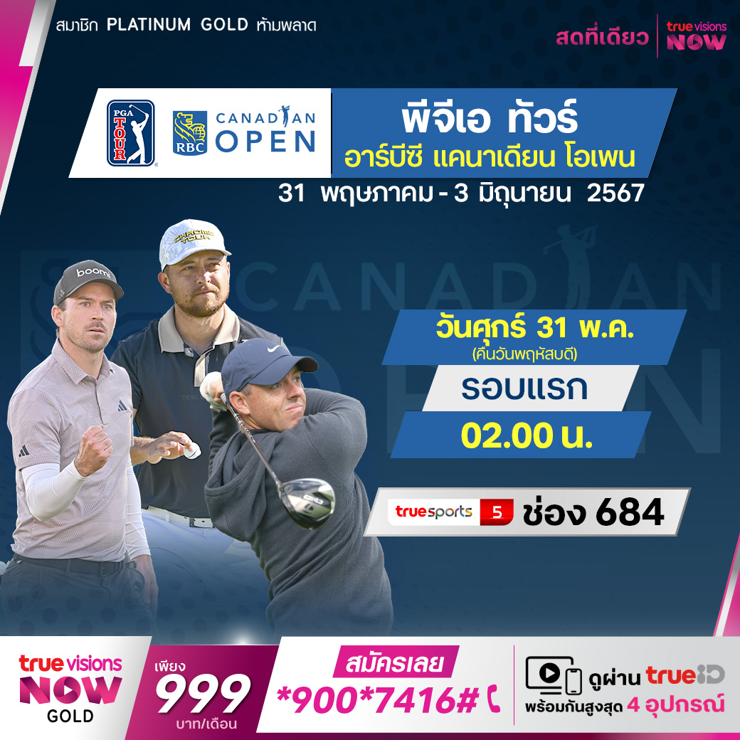 กอล์ฟ พีจีเอ ทัวร์ รายการ อาร์บีซี แคนาเดียน โอเพ่น 2024 ชิงเงินรางวัล 9,400,000 เหรียญสหรัฐฯ ที่สนาม แฮมิลตัน กอล์ฟ แอนด์ คันทรี่ คลับ ในแฮมิลตัน ออนตาริโอ นำโดย รอรี่ แม็คอิลรอย อดีตแชมป์ 2 สมัย ที่เตรียมล่าแชมป์รายการนี้สมัยที่ 3 ลุ้นกันว่าใครจะชูโทรฟี่แชมป์ปีนี้ สด เอ็กซ์คลูซีฟ ครบทุกรอบ ที่เดียว ที่ ทรูวิชั่นส์