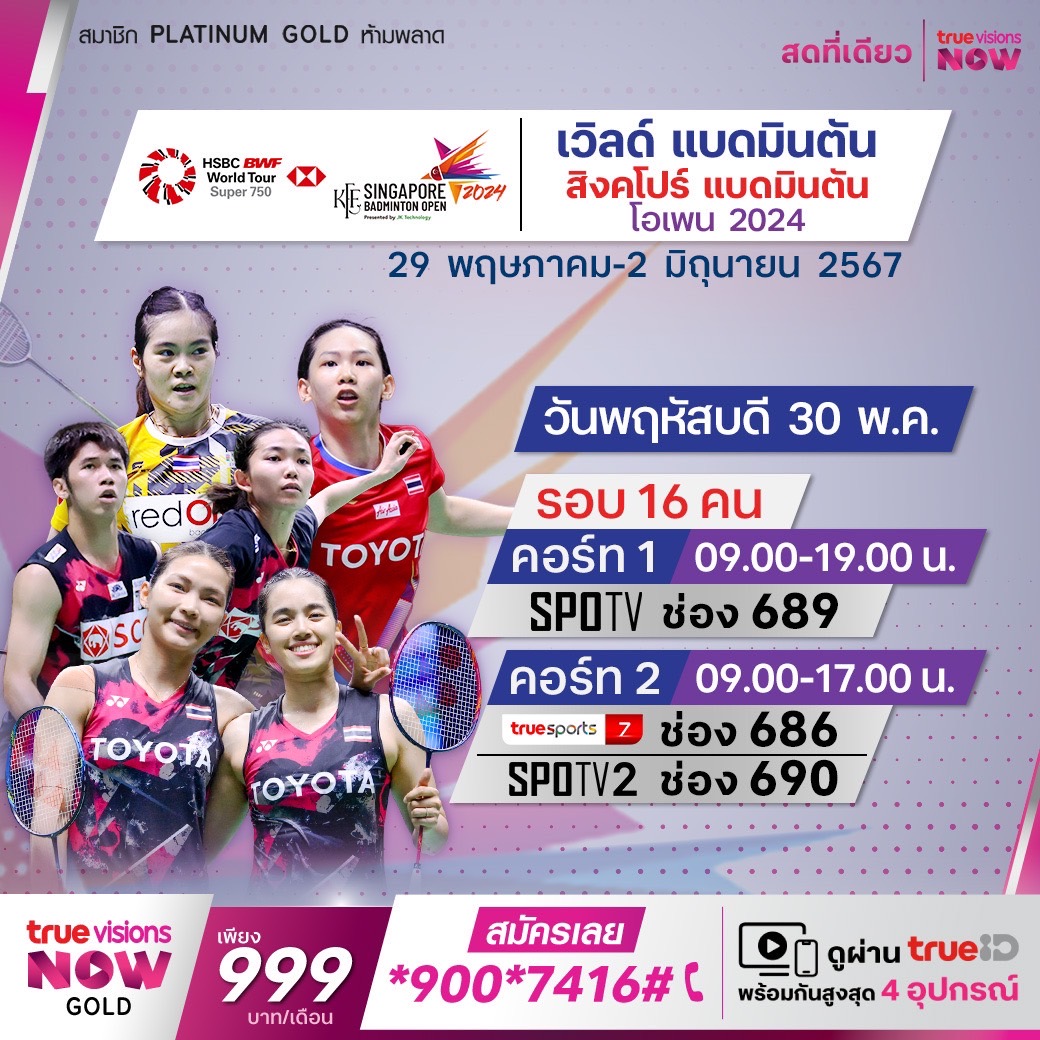 แบดมินตัน บีดับเบิ้ลยูเอฟ รายการ สิงคโปร์ แบดมินตัน โอเพ่น 2024 ความมันส์ระดับเวิลด์ ทัวร์ ซูเปอร์ 750 ที่สิงคโปร์ โดยมีเงินรางวัลล่อใจมากถึง 850,000 เหรียญสหรัฐฯ ใครจะเข้ารอบไปลุ้นแชมป์ ชมสด จุใจ เอ็กซ์คลูซีฟ ที่เดียวที่ ทรูวิชั่นส์