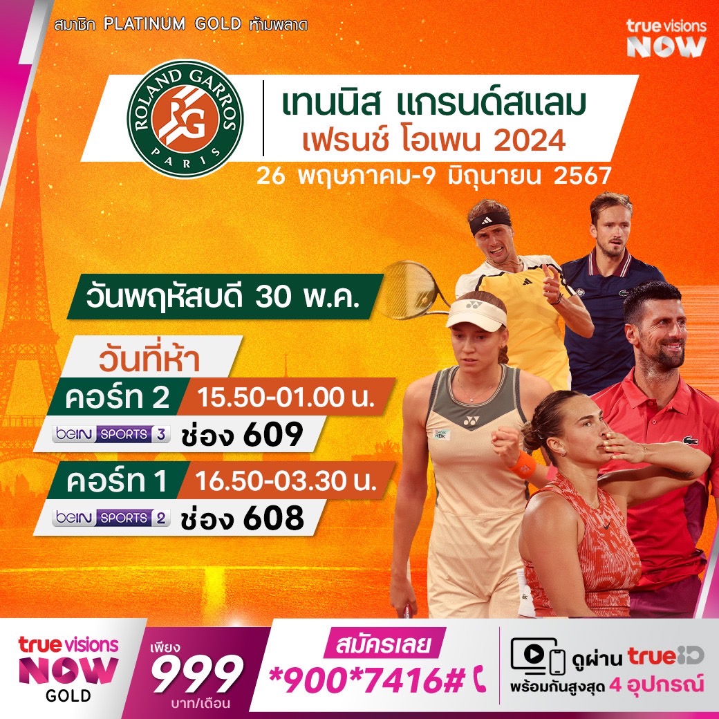 ติดตามชมศึกเทนนิส โรลังด์ การ์รอส หรือ เฟร้นช์ โอเพ่น แกรนด์สแลมที่ 2 ของปี การแข่งขันสุดทรหดบนคอร์ทดิน ที่พิสูจน์ความแข็งแกร่งทั้งร่างกายและจิตใจ ใครจะก้าวไปเป็นแชมป์ในบั้นปลาย ชมสด เอ็กซ์คลูซีฟ ตลอดทั้งทัวร์นาเมนท์ ที่เดียวที่ ทรูวิชั่นส์