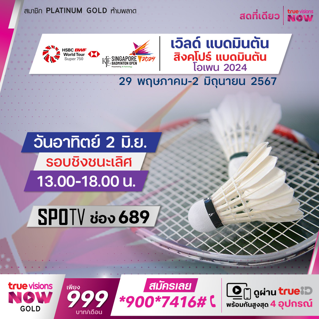 แบดมินตัน บีดับเบิ้ลยูเอฟ รายการ สิงคโปร์ แบดมินตัน โอเพ่น 2024 ความมันส์ระดับเวิลด์ ทัวร์ ซูเปอร์ 750 ที่สิงคโปร์ โดยมีเงินรางวัลล่อใจมากถึง 850,000 เหรียญสหรัฐฯ ร่วมเชียร์นักแบดฝีมือระดับโลกในรอบชิงชนะเลิศ ใครจะคว้าแชมป์ไปครอง ชมสด จุใจ เอ็กซ์คลูซีฟ ที่เดียวที่ ทรูวิชั่นส์