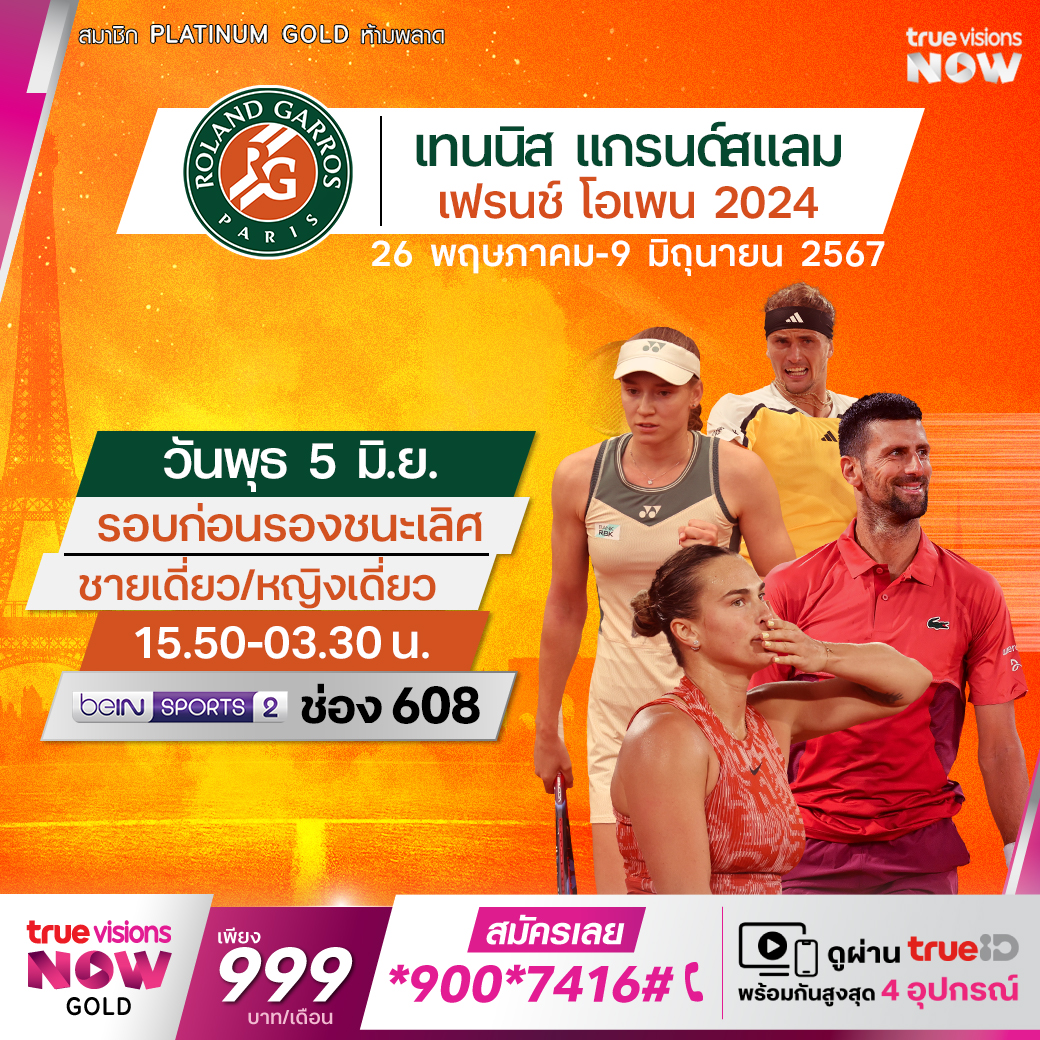 ติดตามชมศึกเทนนิส โรลังด์ การ์รอส หรือ เฟร้นช์ โอเพ่น แกรนด์สแลมที่ 2 ของปี การแข่งขันสุดทรหดบนคอร์ทดิน ที่พิสูจน์ความแข็งแกร่งทั้งร่างกายและจิตใจ มาถึงในรอบก่อนรองชนะเลิศแล้ว ใครจะก้าวไปเป็นแชมป์ในบั้นปลาย ชมสด เอ็กซ์คลูซีฟ ตลอดทั้งทัวร์นาเมนท์ ที่เดียวที่ ทรูวิชั่นส์