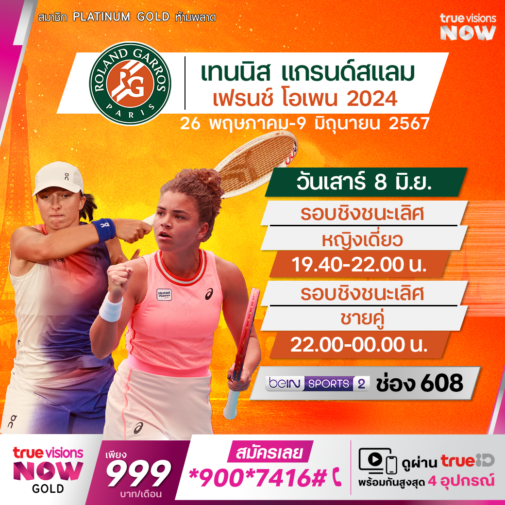 ติดตามชมศึกเทนนิส โรลังด์ การ์รอส หรือ เฟร้นช์ โอเพ่น แกรนด์สแลมที่ 2 ของปี การแข่งขันสุดทรหดบนคอร์ทดิน ที่พิสูจน์ความแข็งแกร่งทั้งร่างกายและจิตใจ มาถึงในรอบชิงชนะเลิศหญิงเดี่ยวแล้ว ใครจะก้าวไปเป็นแชมป์ในบั้นปลาย ชมสด เอ็กซ์คลูซีฟ ตลอดทั้งทัวร์นาเมนท์ ที่เดียวที่ ทรูวิชั่นส์