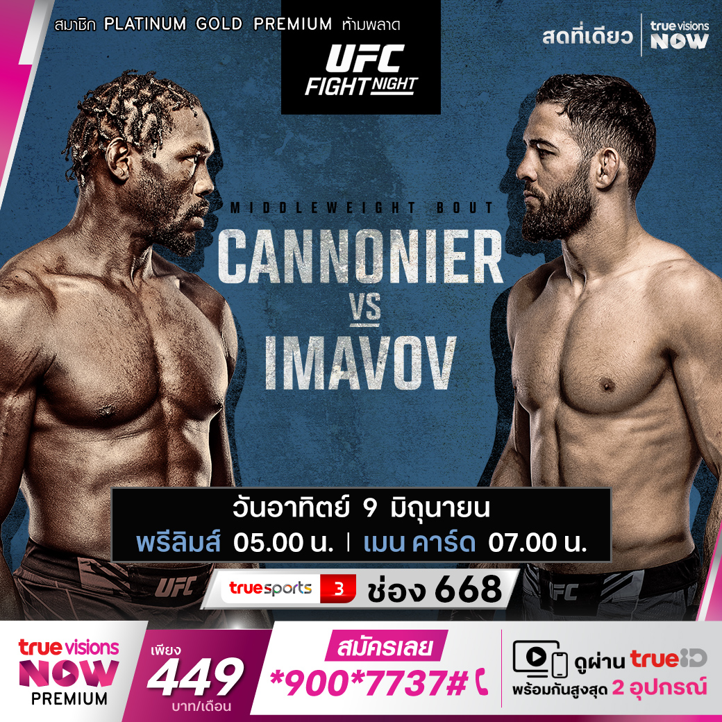 ศึก ยูเอฟซี ไฟต์ ไนท์ ไปสร้างสีสันกันที่ เคเอฟซี ยัม เซนเตอร์ ในเมืองหลุยส์วิลล์ รัฐเคนทักกี้ คู่เอกรุ่นมิดเดิ้ลเวต จาเร็ด แคนโนเนียร์ รองแชมป์อันดับ 4 อดีตผู้ท้าชิงชาวอเมริกัน ปะทะ นัสซอร์ดีน อิมาวอฟ จอมเทคนิคจากฝรั่งเศส สด เอ็กซ์คลูซีฟ จุใจทั้งช่วงพรีลิมส์ และ เมน คาร์ด ที่เดียวที่ ทรูวิชั่นส์