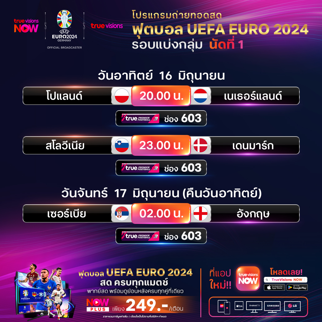 วันนี้มีอะไรดูที่ ทรูวิชั่นส์ ประจำวันอาทิตย์ที่ 16 มิถุนายน 67 ยังคงมีกีฬาที่น่าสนใจให้ได้ตามลุ้นตามเชียร์กันเหมือนเดิม ในส่วนของฟุตบอลนั้น พลาดไม่ได้กับศึกยูโร 2024 ในรอบแบ่งกลุ่ม ส่วนกีฬาอื่นๆ นั้นยังมีศึกเทนนิส เอทีพี ทัวร์ รายการ สตุ๊ตการ์ท โอเพ่น และ ดับเบิ้ลยูทีเอ ทัวร์ อีกสองรายการอย่าง น็อตติ้งแฮม โอเพ่น และ ลิเบม่า โอเพ่น ส่วนกอล์ฟนั้นพลาดไม่ได้กับศึกเมเจอร์ที่ 3 ของปี ยูเอส โอเพ่น และกอล์ฟหญิง แอลพีจีเอ ทัวร์ รายการ แอลพีจีเอ คลาสสิก นอกจากนี้ยังมี แบดมินตัน บีดับเบิ้ลยูเอฟ รายการ ออสเตรเลียน โอเพ่น งานนี้ ทรูวิชั่นส์ จัดเต็มให้ชมกันถึงบ้าน