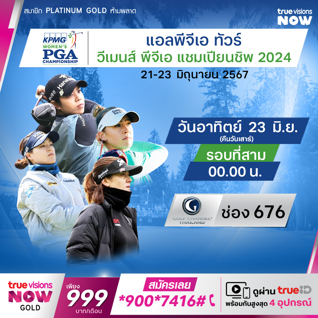 กอล์ฟหญิง แอลพีจีเอ ทัวร์ รายการเมเจอร์ลำดับที่ 3 ของปี เคพีเอ็มจี วีเมนส์ พีจีเอ แชมเปี้ยนชิพ 2024 ที่สนาม ซาฮาลี คันทรี่ คลับ ในแซมมามิช รัฐวอชิงตัน ร่วมเชียร์ โปรสาวไทย ทำผลงานเบียดแย่งแชมป์กับโปรแถวหน้าของทัวร์ พร้อมกับชิงเงินรางวัลรวมมากถึง 370 ล้านบาท สด ครบทุกรอบ ที่ ทรูวิชั่นส์