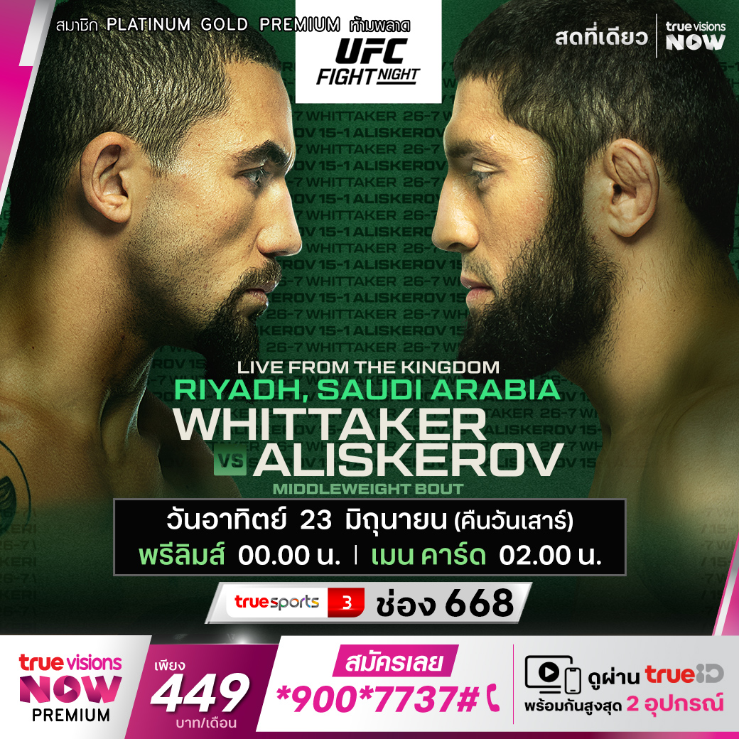ยูเอฟซี ไฟต์ ไนท์ ยกทีมนักสู้ชุดใหญ่บุกมาสร้างสีสันในตะวันออกกลาง ที่ คิงดอม อารีน่า ในกรุงริยาดห์ ซาอุดิอาระเบีย เป็นครั้งแรก คู่เอก อดีตแชมป์ รอเบิร์ต วิทเทเกอร์ จากออสเตรเลีย เปิดศึกกับ อิคราม อลิสเครอฟ นักสู้จากรัสเซีย สดจุใจ ตั้งแต่ พรีลิมส์ ถึง เมน คาร์ด เอ็กซ์คลูซีฟ ที่เดียว ที่ ทรูวิชั่นส์