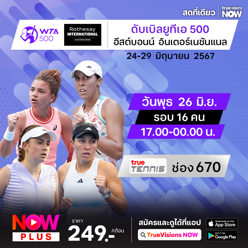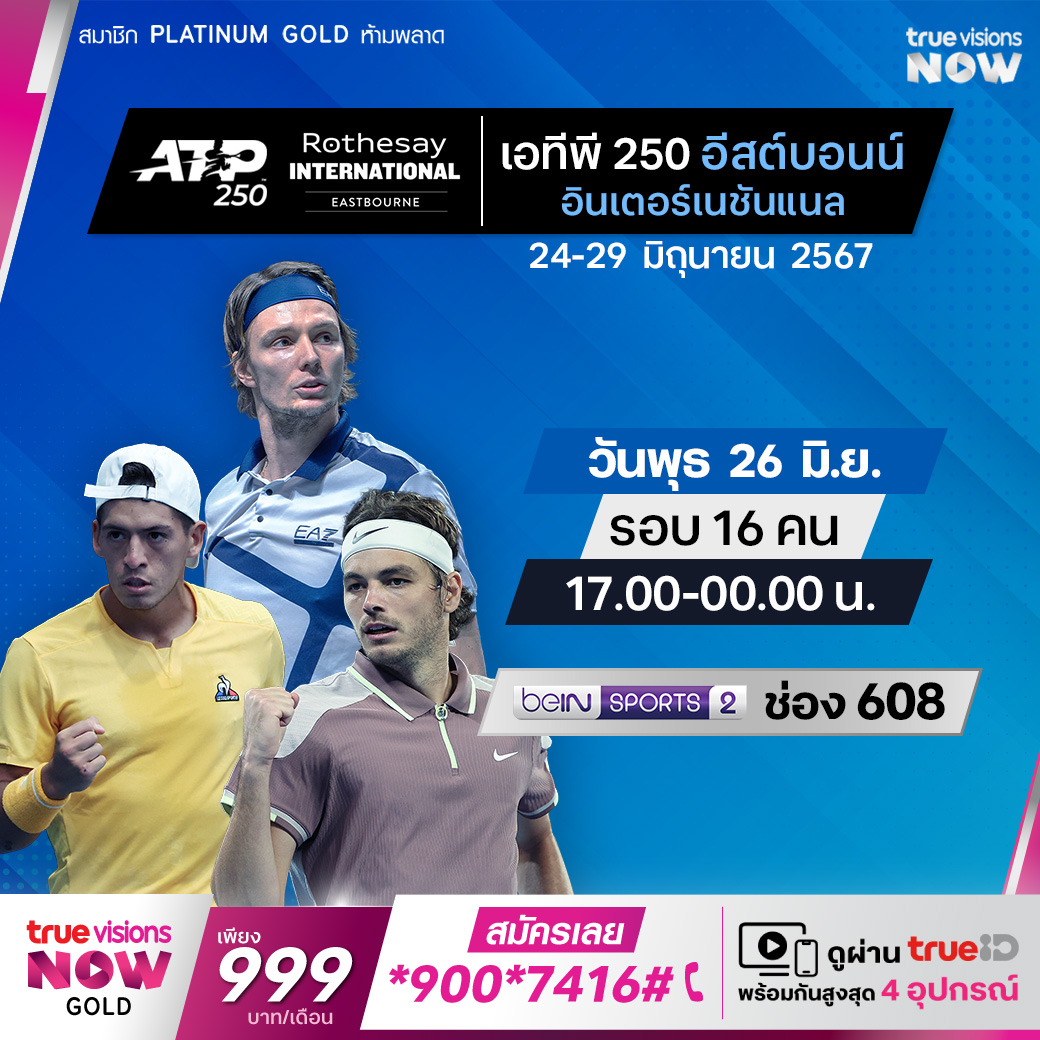 ติดตามชมเทนนิสชาย เอทีพี ทัวร์ รายการ อีสต์บอร์น อินเตอร์เนชั่นแนล ซึ่งเป็นสุดท้ายก่อนเข้าสู่ แกรนด์สแลม วิมเบิลดัน จากเมือง อีสต์บอร์น สหราชอาณาจักร บรรดานักเทนนิสชื่อดังร่วมแข่งขันกันคับคั่ง ร่วมลุ้นว่าใครจะทำผลงานได้ดีที่สุดและคว้าแชมป์ไปครอง ชมสด ตั้งแต่รอบแรกถึงรอบชิงชนะเลิศที่ ทรูวิชั่นส์