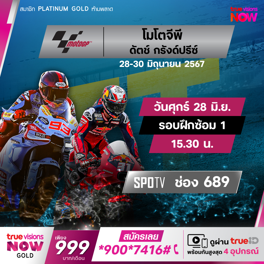 โมโต จีพี เวิลด์ แชมเปี้ยนชิพ รายการ ดัตช์ กรังด์ปรีซ์ ที่ สนาม ทีที เซอร์กิต แอสเซ่น สังเวียนชื่อดังของทวีปยุโรปที่จัดการแข่งขันระดับโลกมาตั้งแต่ปี 1955 มันส์กันทุกโค้ง บิดสุดไมล์ทุกทางตรง ทั้งรุ่น โมโต 3, โมโต 2 และ สุดๆ กับรุ่นพรีเมียร์คลาส อย่าง โมโต จีพี ที่การลุ้นแชมป์ดุเดือดแบบไม่มีใครยอมใคร ทั้งแชมป์เก่าและผู้ท้าชิง ชมสด จุใจ ที่ทรูวิชั่นส์