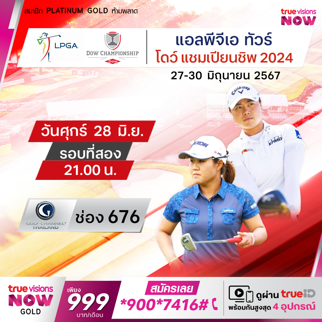 กอล์ฟหญิง แอลพีจีเอ ทัวร์ รายการ โดว์ แชมเปี้ยนชิพ ที่สนาม มิดแลนด์ คันทรี่ คลับ ในมิดแลนด์ รัฐมิชิแกน แข่งขันแบบทีม 2 คน ที่จะต้องอาศัยฝีมือและทีมเวิร์คในการทำสกอร์เพื่อแย่งชิงกันคว้าแชมป์ โดยมีเงินรางวัลรวมให้ชิงกันถึง 109 ล้านบาท ร่วมเชียร์และลุ้นกันว่าทีมสาวไทยจะคว้าแชมป์ได้อีกครั้งหรือไม่ ชมสด ครบทุกรอบ ที่ ทรูวิชั่นส์