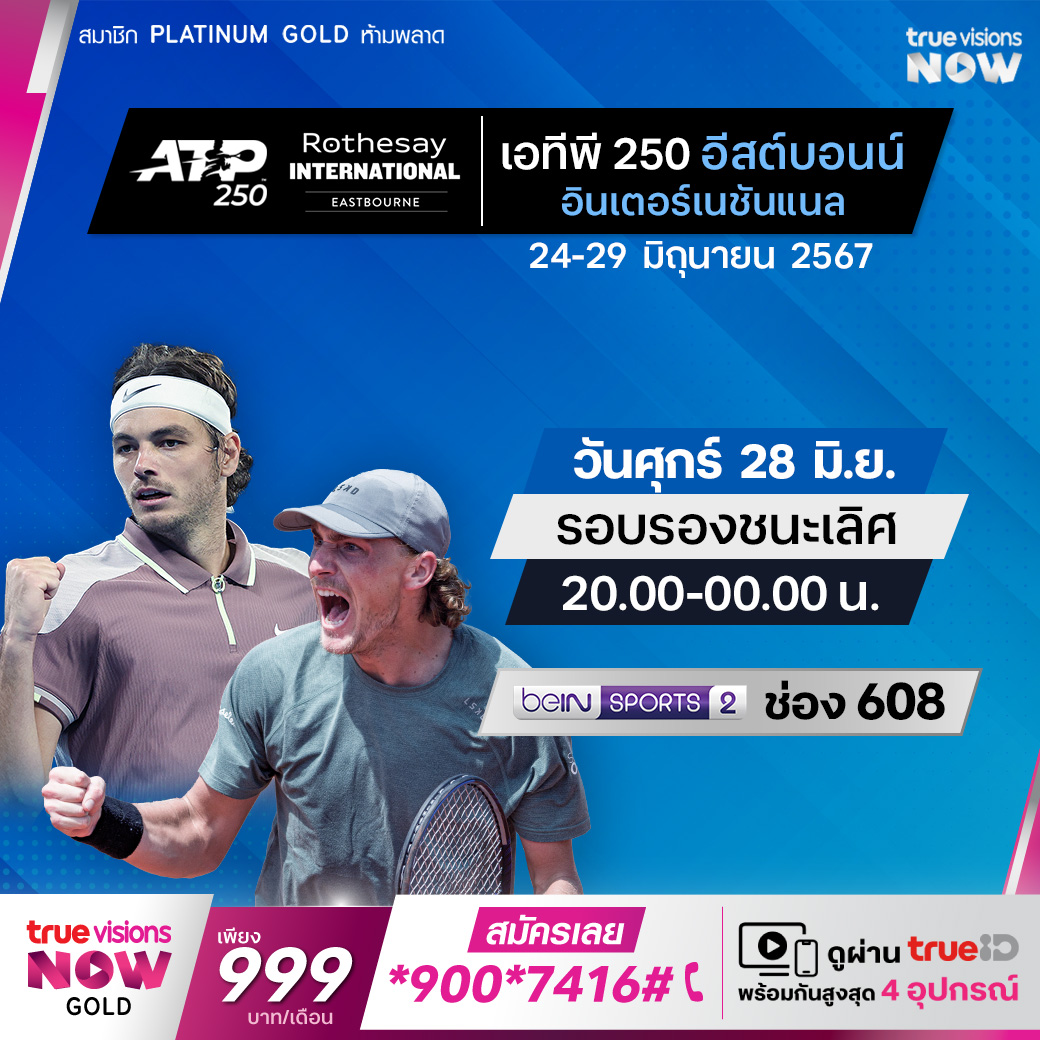 ติดตามชมเทนนิสชาย เอทีพี ทัวร์ รายการ อีสต์บอร์น อินเตอร์เนชั่นแนล ซึ่งเป็นรายการสุดท้ายก่อนเข้าสู่ แกรนด์สแลม วิมเบิลดัน จากเมือง อีสต์บอร์น สหราชอาณาจักร ในรอบรองชนะเลิศ ร่วมลุ้นว่าใครจะทำผลงานได้ดีที่สุดและคว้าแชมป์ไปครอง ชมสด ที่ ทรูวิชั่นส์
