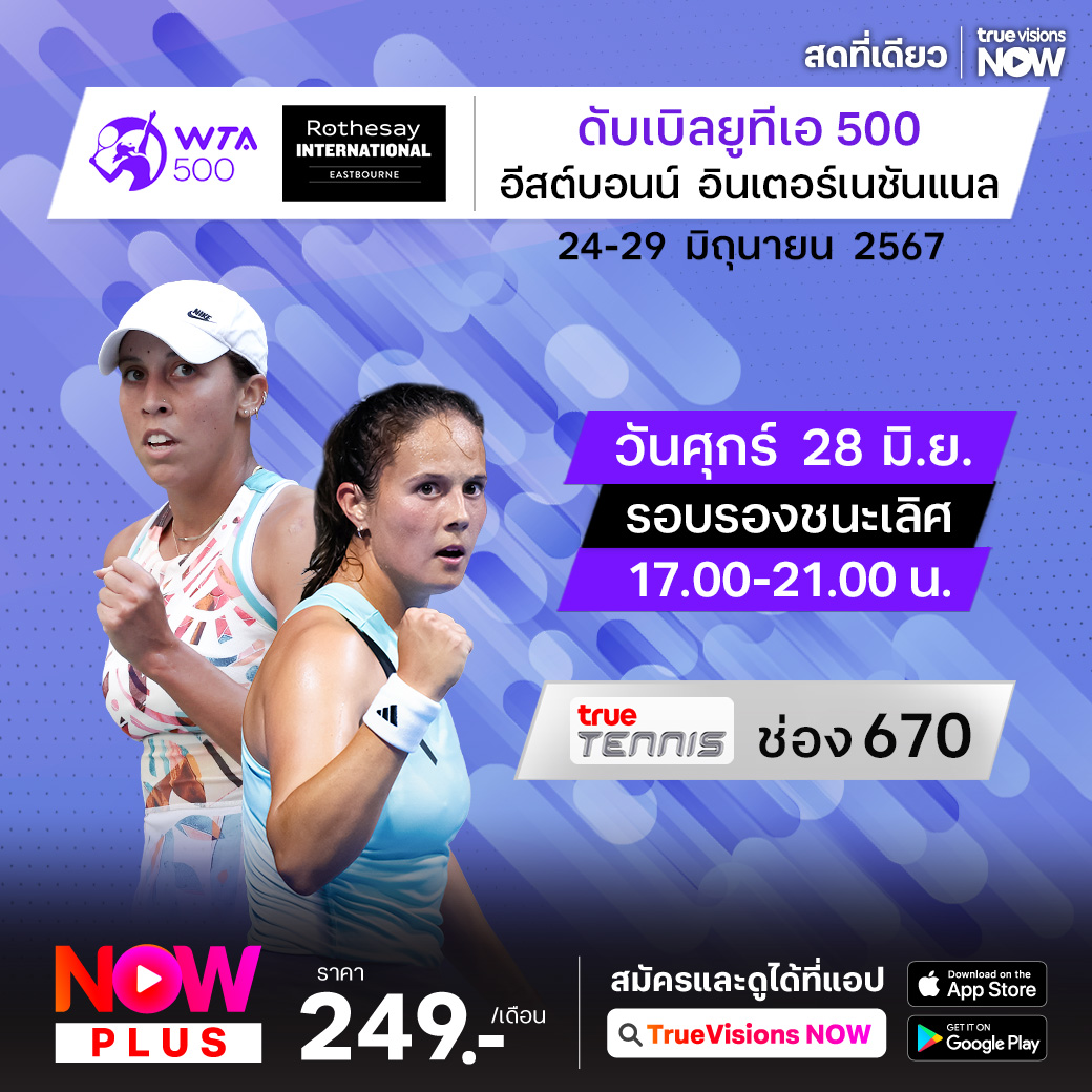 ชมและเชียร์เทนนิสหญิง ดับเบิ้ลยูทีเอ ทัวร์ รายการ อีสต์บอร์น อินเตอร์เนชั่นแนล ที่สหราชอาณาจักร ในรอบรองชนะเลิศ ซึ่งเป็นรายการสุดท้ายเพื่อเตรียมตัวก่อนเข้าสู่ แกรนด์สแลม วิมเบิลดัน ร่วมลุ้นกันว่าสุดท้ายใครจะเป็นผู้ที่คว้าแชมป์ไปครอง ชมสด ที่ ทรูวิชั่นส์