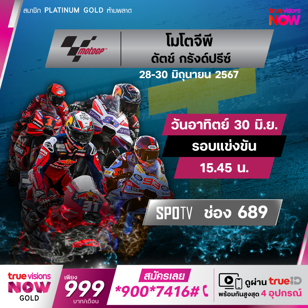 โมโต จีพี เวิลด์ แชมเปี้ยนชิพ รายการ ดัตช์ กรังด์ปรีซ์ ที่ สนาม ทีที เซอร์กิต แอสเซ่น สังเวียนชื่อดังของทวีปยุโรปที่จัดการแข่งขันระดับโลกมาตั้งแต่ปี 1955 มันส์กันทุกโค้ง บิดสุดไมล์ทุกทางตรง ทั้งรุ่น โมโต 3, โมโต 2 และ สุดๆ กับรุ่นพรีเมียร์คลาส อย่าง โมโต จีพี ที่การลุ้นแชมป์ดุเดือดแบบไม่มีใครยอมใคร ทั้งแชมป์เก่าและผู้ท้าชิง ชมสด จุใจ ที่ทรูวิชั่นส์