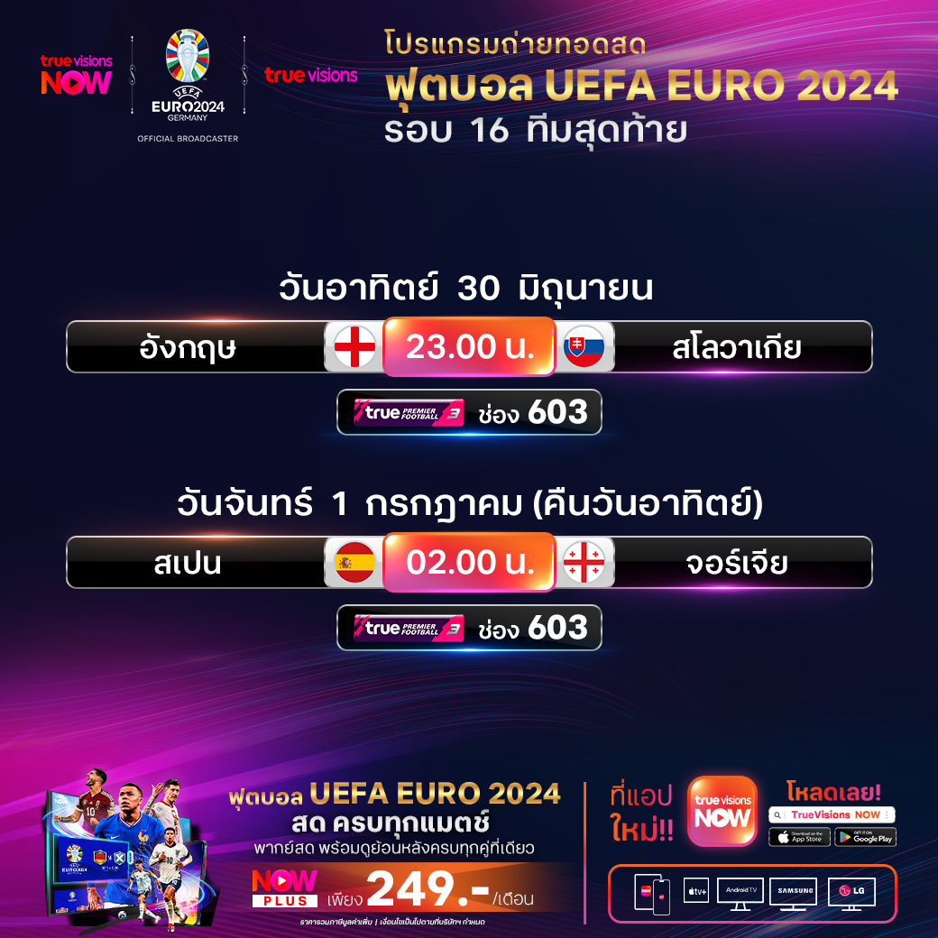 วันนี้มีอะไรดูที่ ทรูวิชั่นส์ ประจำวันอาทิตย์ที่ 30 มิถุนายน 67 ยังคงมีกีฬาที่น่าสนใจให้ได้ตามลุ้นตามเชียร์กันเหมือนเดิม ในส่วนของฟุตบอลนั้น ยังมีศึก ยูโร 2024 ที่เดินทางมาถึงในรอบ 16 ทีมสุดท้ายแล้ว นอกจากนี้คอมอเตอร์สปอร์ตยังพลาดไม่ได้กับศึก ฟอร์มูล่า วัน รายการ ออสเตรียน กรังด์ปรีซ์ และ โมโต จีพี รายการ ดัตช์ กรังด์ปรีซ์ ส่วนกีฬาอื่นๆ นั้นยังมีกอล์ฟ พีจีเอ ทัวร์ รายการ ร็อคเก็ต มอร์ทเกจ คลาสสิก, ดีพี เวิลด์ ทัวร์ รายการ อิตาเลียน โอเพ่น, แอลพีจีเอ ทัวร์ รายการ โดว์ แชมเปี้ยนชิพ และ แบดมินตัน บีดับเบิ้ลยูเอฟ รายการ ยูเอส โอเพ่น งานนี้ ทรูวิชั่นส์ จัดเต็มให้ชมกันถึงบ้าน