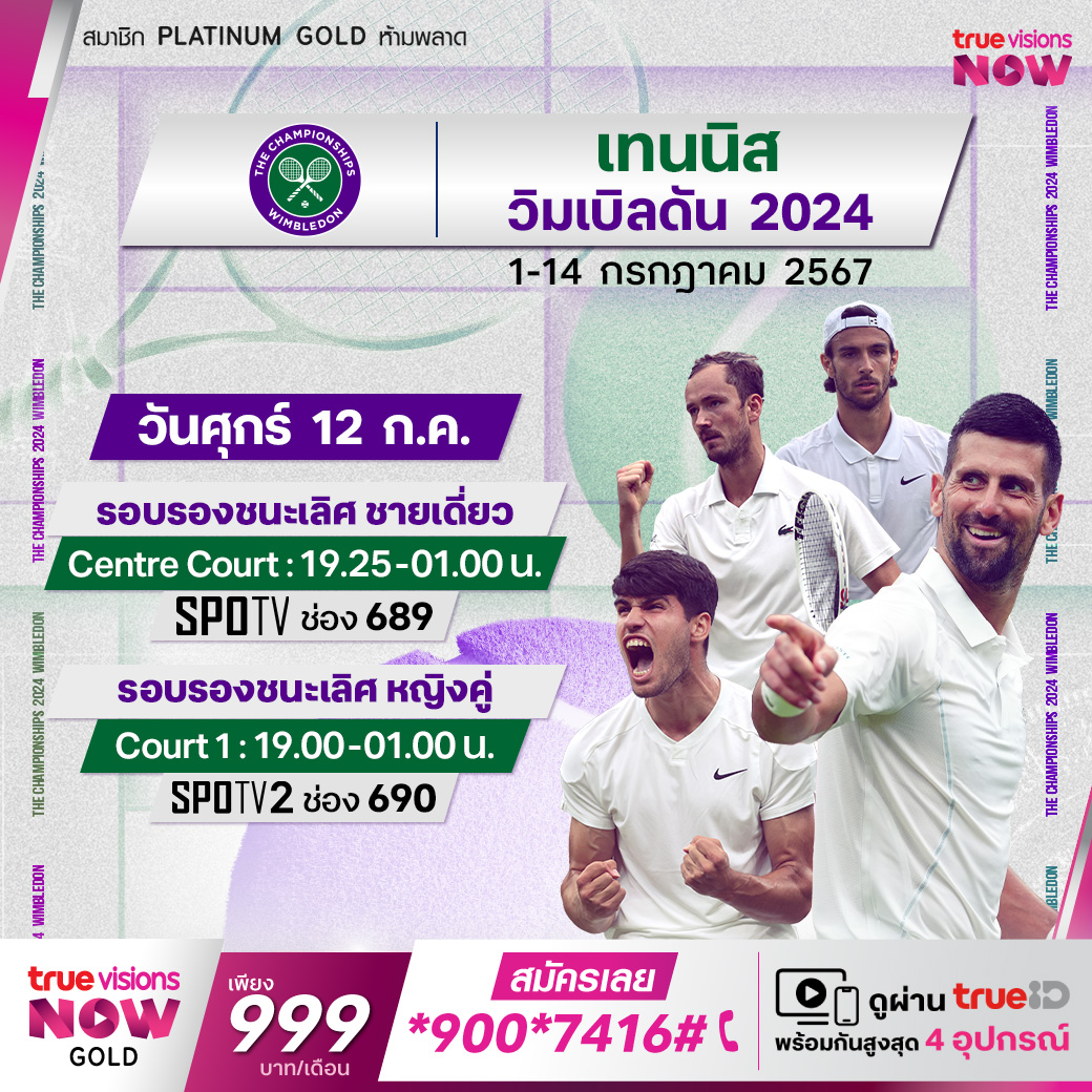 ติดตามชมการแข่งขันเทนนิส วิมเบิลดัน แกรนด์สแลมที่ 3 ของปี การแข่งขันบนคอร์ทหญ้าที่คลาสสิคและเป็นแกรนด์สแลมที่เก่าแก่ที่สุด จากกรุงลอนดอน สหราชอาณาจักร มาถึงในรอบรองชนะเลิศประเภทชายเดี่ยวแล้ว ร่วมลุ้นกันว่า ใครจะคว้าแชมป์เทนนิสรายการที่มีมนต์ขลังและเก่าแก่ที่สุดรายการนี้ไปครอง ชมสด เอ็กซ์คลูซีฟ ตั้งแต่รอบแรกจนถึงรอบชิงชนะเลิศ ที่ ทรูวิชั่นส์