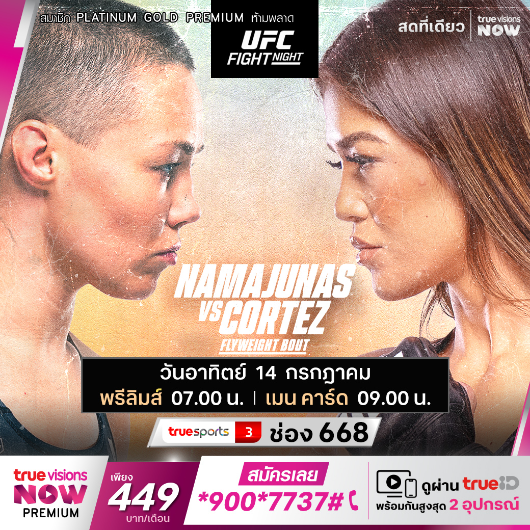 ศึกยูเอฟซี ไฟต์ ไนท์ ที่ เบลล์ อารีน่า ในเดนเวอร์ รัฐโคโลราโด้ คู่เอกเป็นการวัดกัน ของ 2 นักสู้สาวแถวหน้าของวงการรุ่นฟลายเวต โรส นามายูนัส อดีตแชมป์ชาวเมริกัน รองแชมป์อันดับ 6 ปะทะ เทรซี่ คอร์เทซ ร่วมด้วยรุ่นไลต์เวต ดรูว์ โดเบอร์ พบ ไมค์ เดวิส ชมสด เอ็กซ์คลูซีฟ ที่เดียวที่ ทรูวิชั่นส์