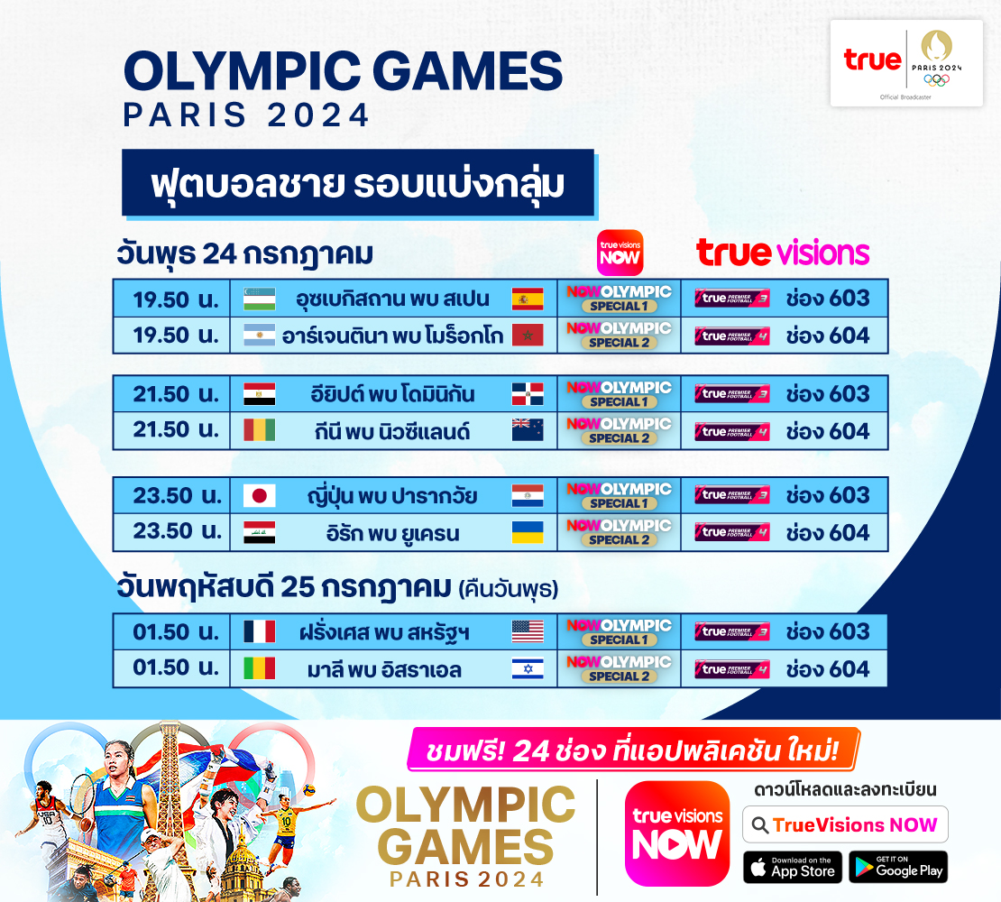 ฟุตบอลชาย รอบแบ่งกลุ่ม อาร์เจนตินา พบ โมรอคโค เวลา 19.50 - 22.00 ทางช่อง TPF4 (604)