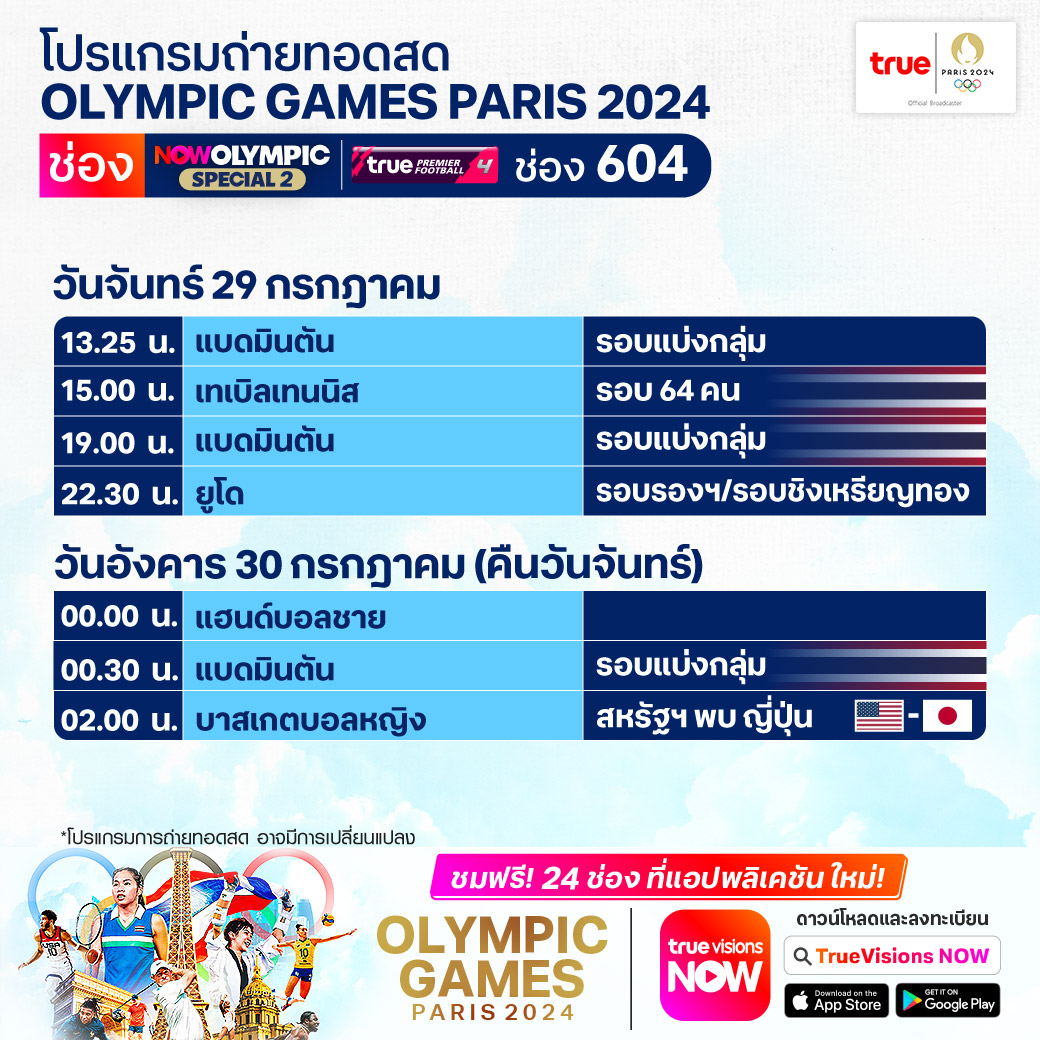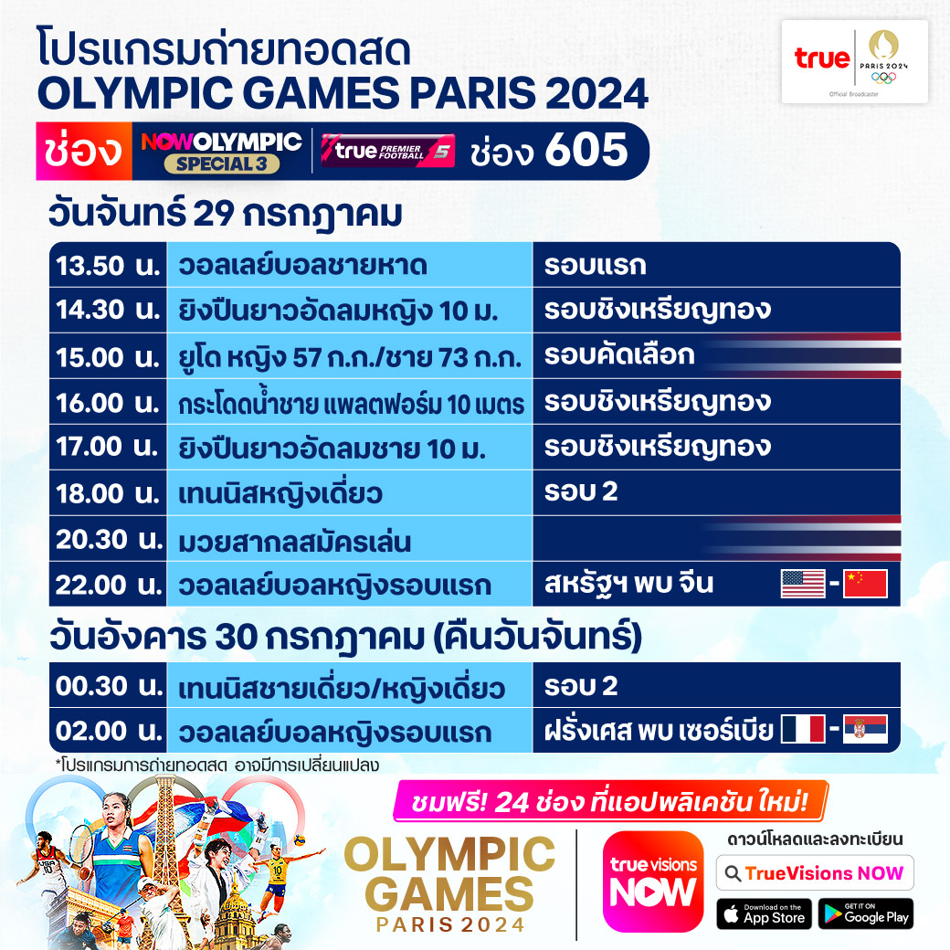 วันนี้มีอะไรดูที่ ทรูวิชั่นส์ ประจำวันจันทร์ที่ 29 กรกฎาคม 67 ยังคงมีกีฬาที่น่าสนใจให้ได้ตามลุ้นตามเชียร์กันเหมือนเดิม ในส่วนของ โอลิมปิก เกมส์ 2024 ยังมีถ่ายาอดสดให้ชมกันจุใจเหมือนเคย ส่วนกีฬาอื่่นๆ ยังมีเทนนิส เอทีพี ทัวร์ และ ดับเบิ้ลยูทีเอ ทัวร์ รายการ วอชิงตัน โอเพ่น งานนี้ ทรูวิชั่นส์ จัดเต็มให้ชมกันถึงบ้าน
