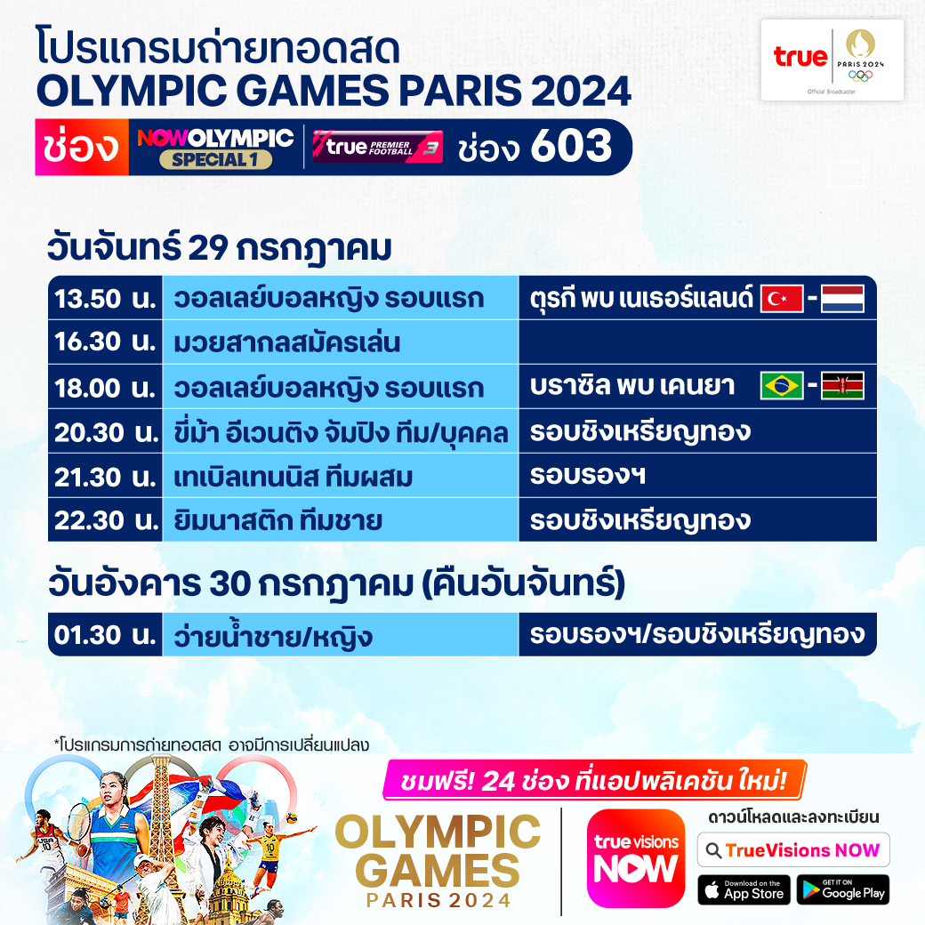 เวลา 13:50 วอลเลย์บอลหญิงรอบแรก ตุรกี พบ เนเธอร์แลนด์ ทางช่อง TPF3 (603)
