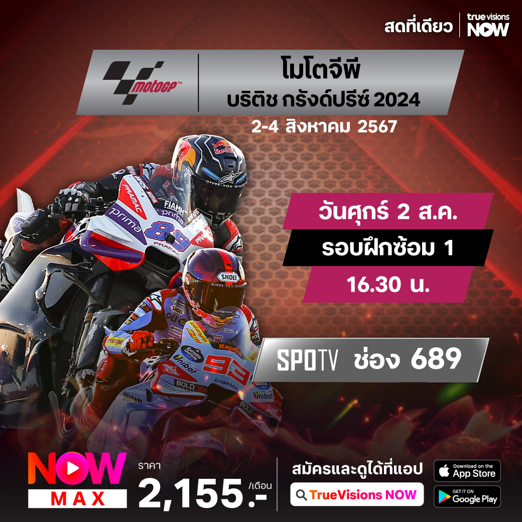 ศึกมอเตอร์ไซค์ชิงแชมป์โลก โมโต จีพี เดินทางมาถึงสนามที่ 10 ครึ่งทางของซีซั่น ในรายการ บริติช กรังด์ปรีซ์ ที่สนาม ซิลเวอร์สโตน เซอร์กิต ประเทศอังกฤษ ใครจะคว้าชัยทั้งรุ่น โมโต 3, โมโต 2 และพลาดไม่ได้กับ โมโต จีพี ที่การล่าตำแหน่งแชมป์กำลังคู่คี่สูสี ระหว่าง แชมป์ ฟรานซิสโก้ บันญาญ่า กับผู้ท้าชิง ฮอร์เฮ มาร์ติน ชมสด จุใจ ครบทุกช่วง ทางทรูวิชั่นส์