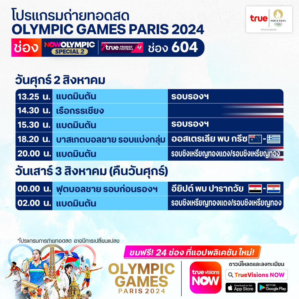เวลา 00:00 ฟุตบอลชายรอบก่อนรองฯ อียิปต์ พบ ปารากวัย ทางช่อง TPF4 (604)