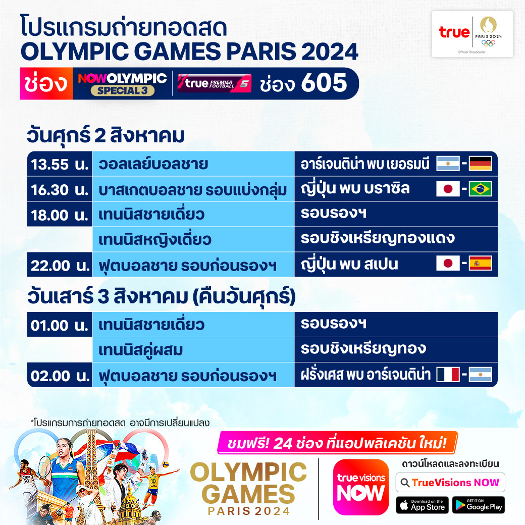 เวลา 02:00 ฟุตบอลชายรอบก่อนรองฯ ฝรั่งเศส พบ อาร์เจนติน่า ทางช่อง TPF5 (605)