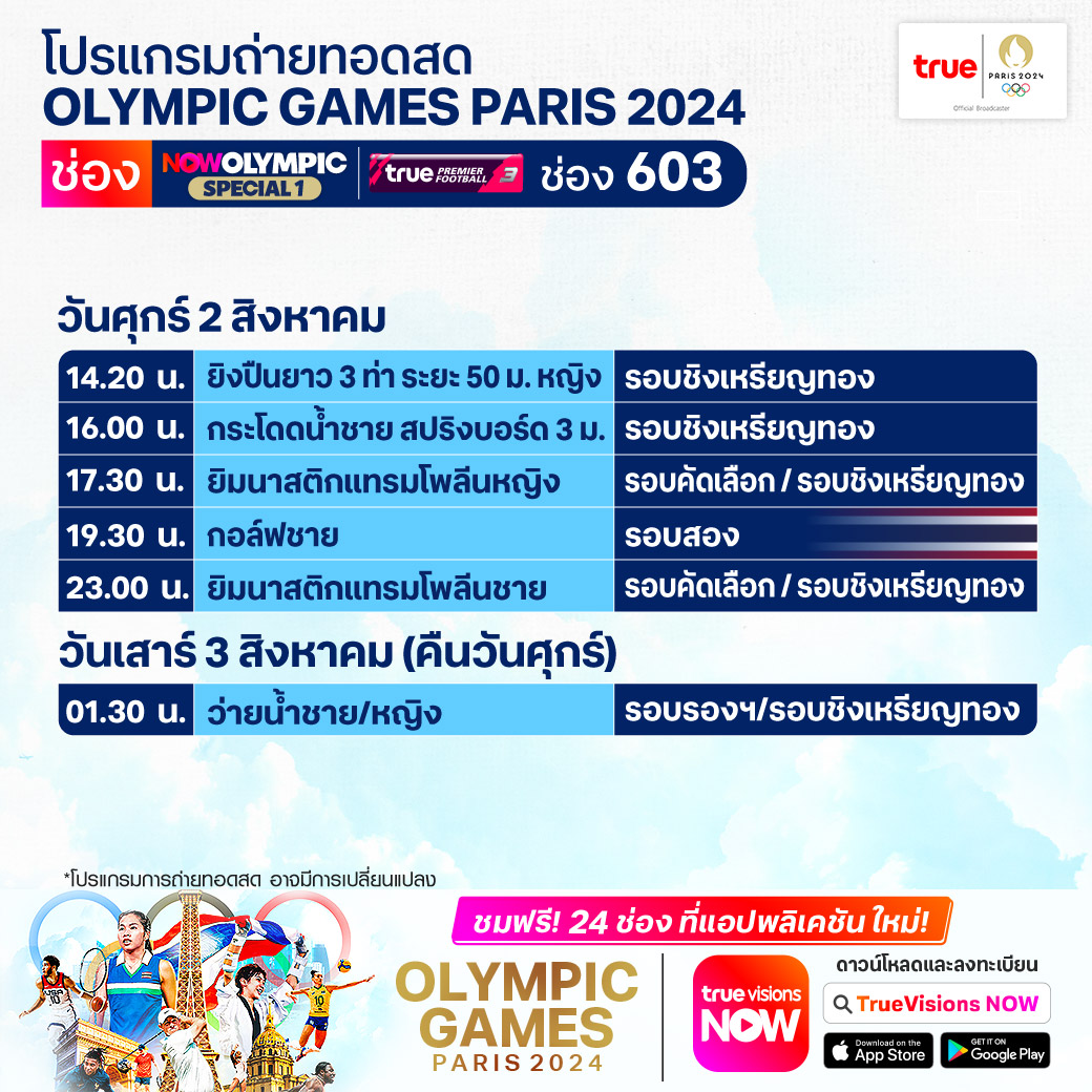 เวลา 01:30 ว่ายน้ำรอบรองฯ - รอบชิงเหรียญทอง ทางช่อง TPF3 (603)