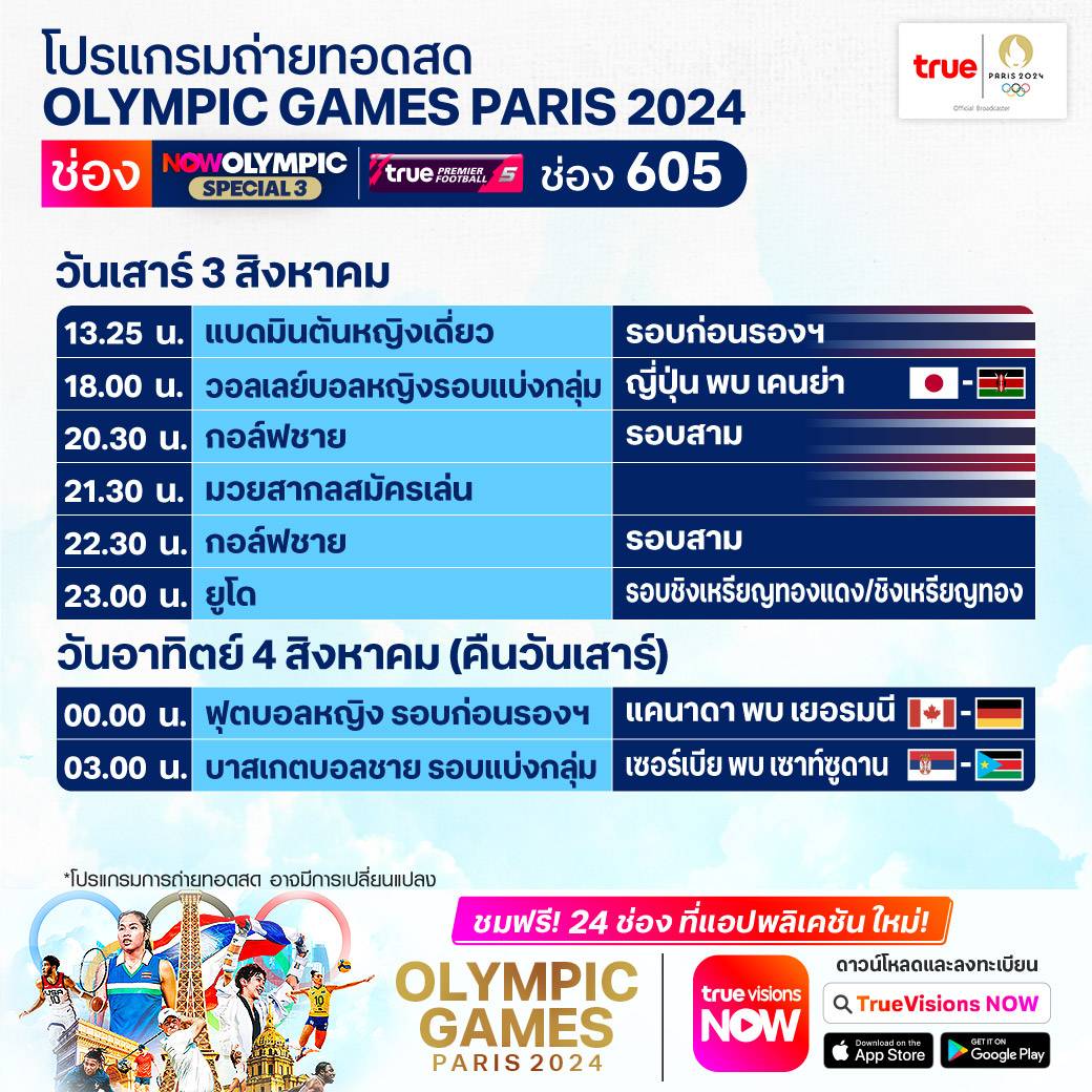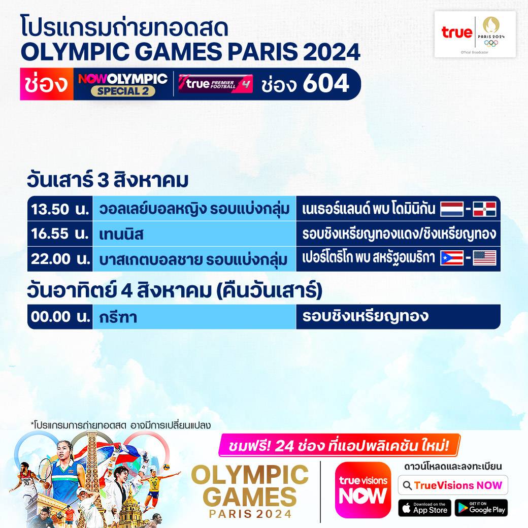 เวลา 13:50 วอลเลย์บอลหญิงรอบแบ่งกลุ่ม เนเธอร์แลนด์ พบ โดมินิกัน ทางช่อง TPF4 (604)
